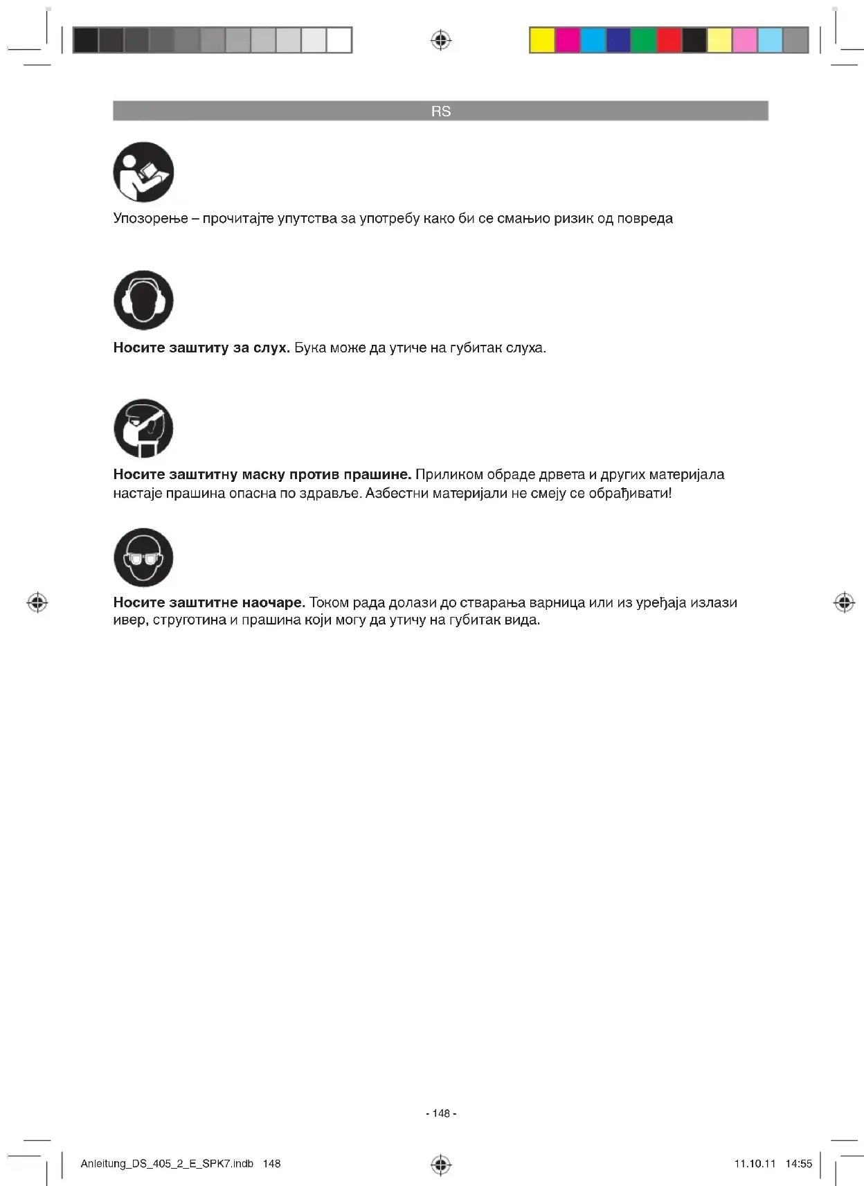 Упозорење – прочитајте упутства за употребу како би се смањио ризик од повреда Носите заштиту за слух. Бука може да утиче на губитак слуха. Носите заштитне наочаре. Током рада долази до стварања варница или из уређаја излази ивер, струготина и прашина који могу да утичу на губитак вида. Носите заштитну маску против прашине. Приликом обраде дрвета и других материјала настаје прашина опасна по здравље. Азбестни материјали не смеју се обрађивати! Anleitung_DS_405_2_E_SPK7.indb 148Anleitung_DS_405_2_E_SPK7.indb 148 11.10.11 14:5511.10.11 14:55RS