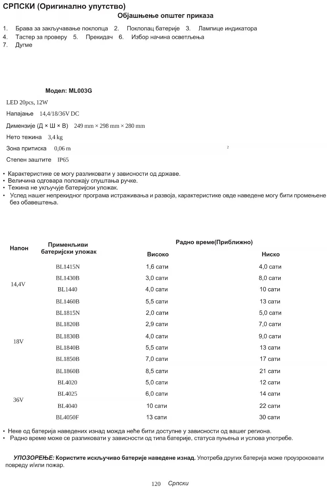 - Радновремеможесеразликоватиузависностиодтипабатерије,статусапуњењаиусловаупотребе. УПОЗОРЕЊЕ: Користите искључиво батерије наведене изнад.Употребадругихбатеријаможепроузроковати повредуи/илипожар. Српски121
