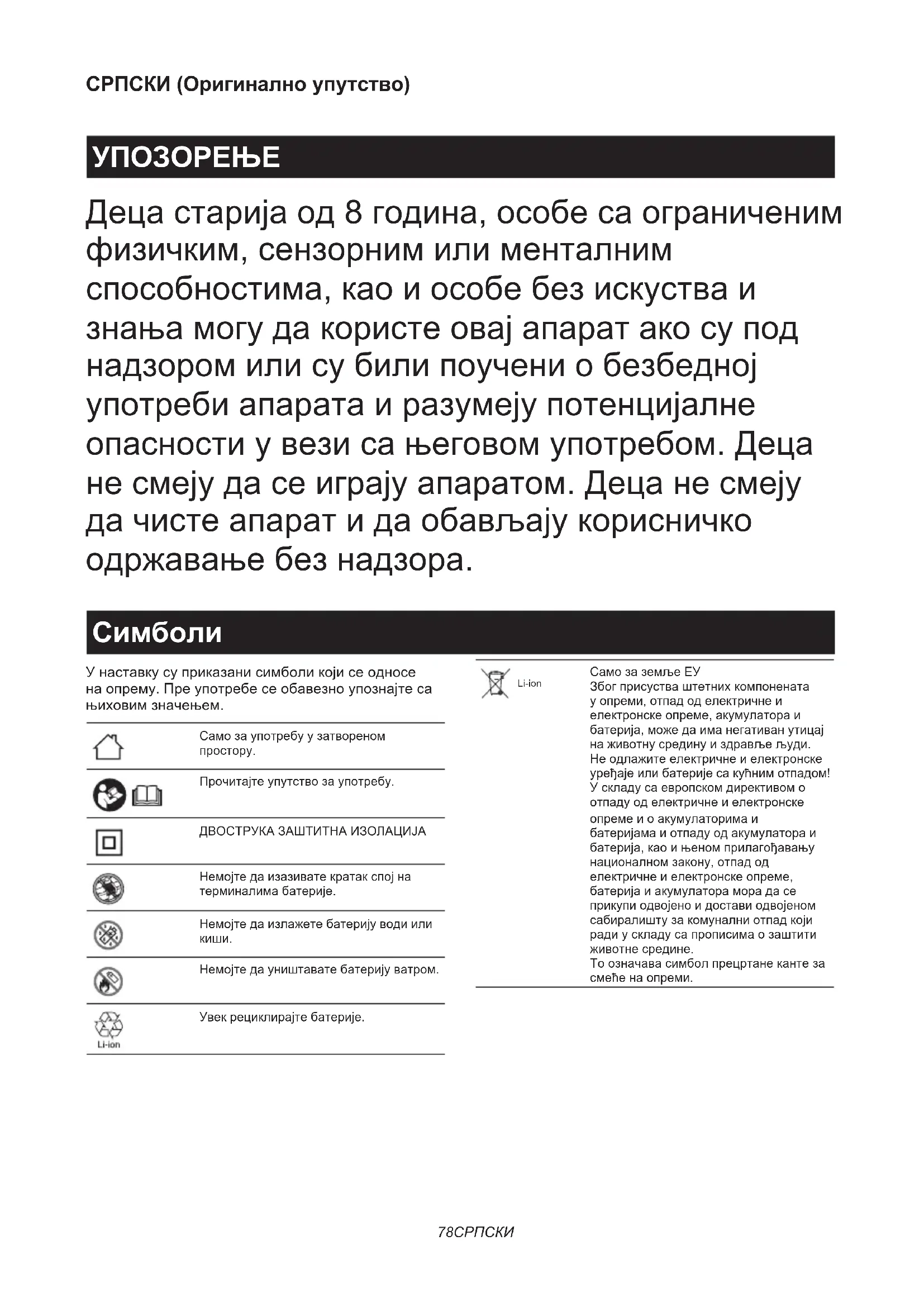 Прочитајте упутство за употребу. ДВОСТРУКА ЗАШТИТНА ИЗОЛАЦИЈА Немојте да изазивате кратак спој на терминалима батерије. Немојте да излажете батерију води или