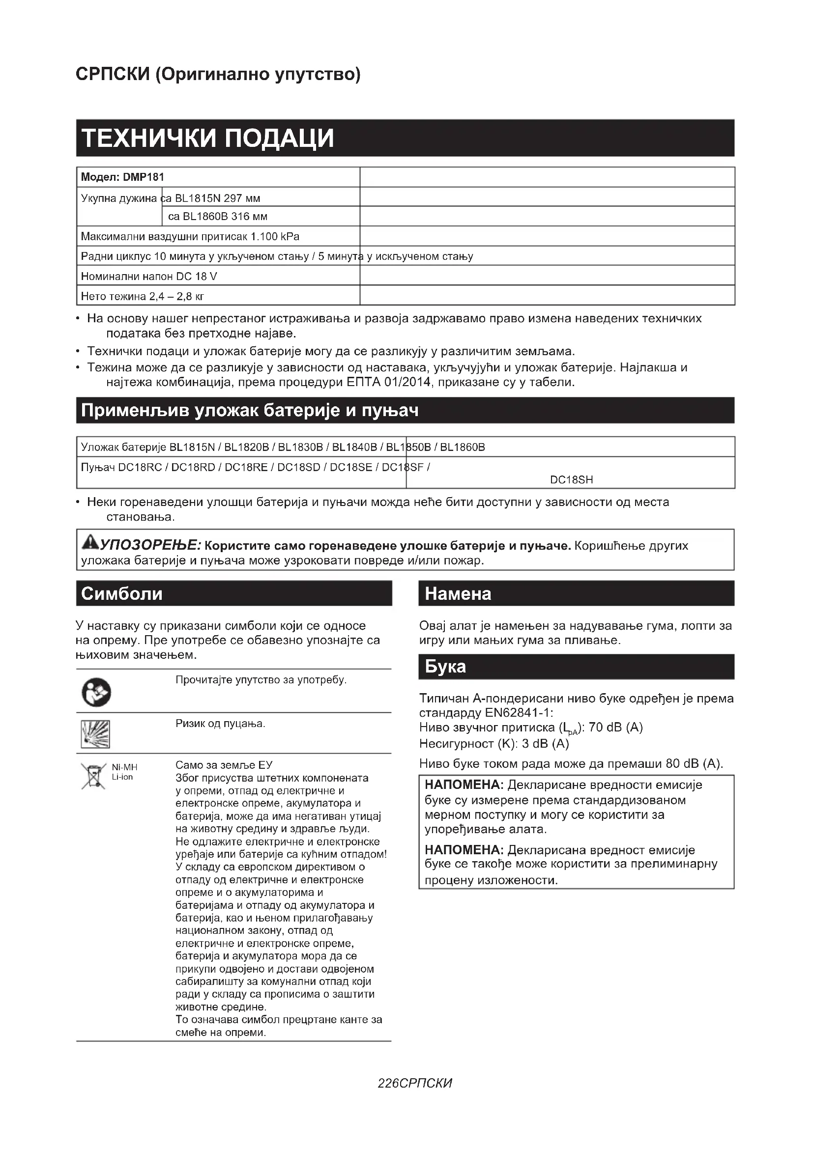 - Оригинална батерија и полнач на Makita НАПОМЕНА: Некои ставки на листата може да се вклучени со алатот како стандарден прибор. Тие може да се разликуваат од држава до држава.226 СРПСКИ СРПСКИ (Оригинално упутство) ТЕХНИЧКИ ПОДАЦИ Модел: DMP181 Укупна дужина са BL1815N 297 мм са BL1860B 316 мм Максимални ваздушни притисак 1.100 kPa Радни циклус 10 минута у укљученом стању / 5 минута у искљученом стању Номинални напон DC 18 V Нето тежина 2,4 – 2,8 кг