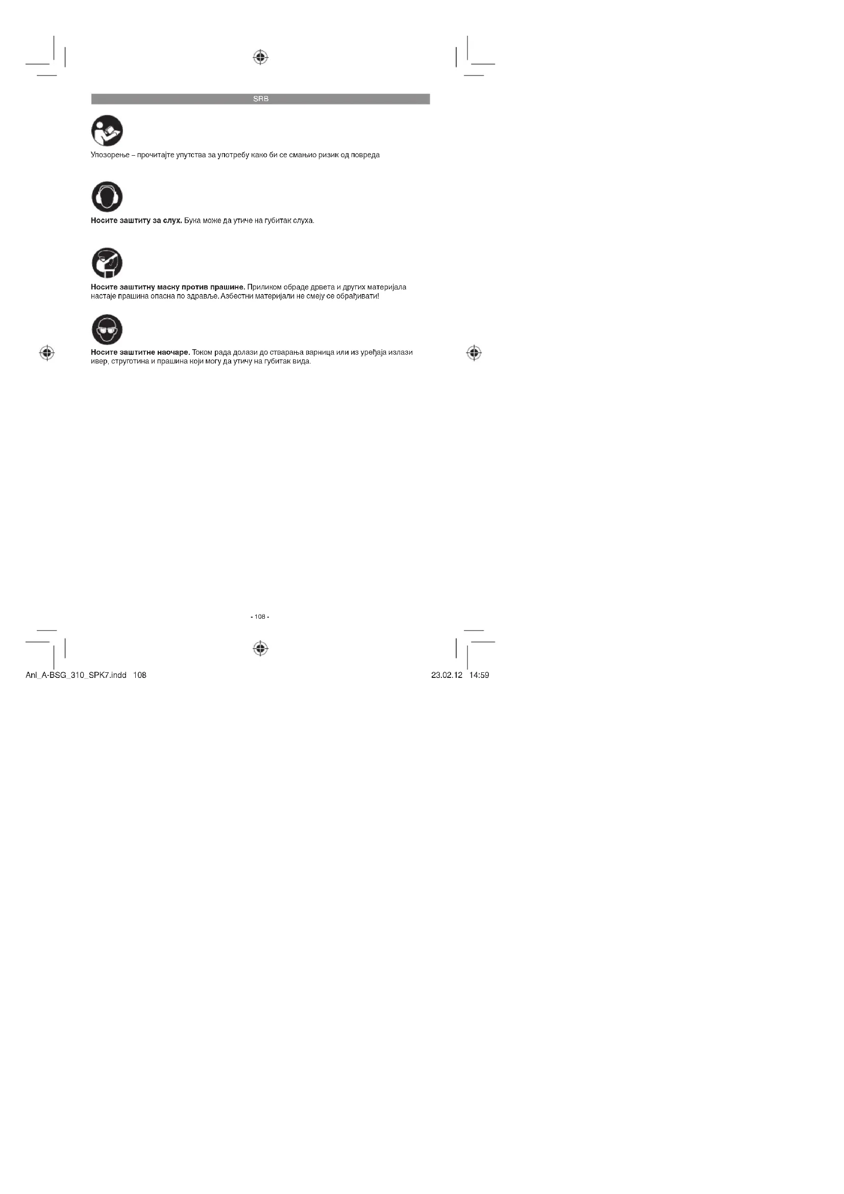 Упозорење – прочитајте упутства за употребу како би се смањио ризик од повреда Носите заштиту за слух. Бука може да утиче на губитак слуха. Носите заштитне наочаре. Током рада долази до стварања варница или из уређаја излази ивер, струготина и прашина који могу да утичу на губитак вида. Носите заштитну маску против прашине. Приликом обраде дрвета и других материјала настаје прашина опасна по здравље. Азбестни материјали не смеју се обрађивати! Anl_A-BSG_310_SPK7.indd 108Anl_A-BSG_310_SPK7.indd 108 23.02.12 14:5923.02.12 14:59SRB