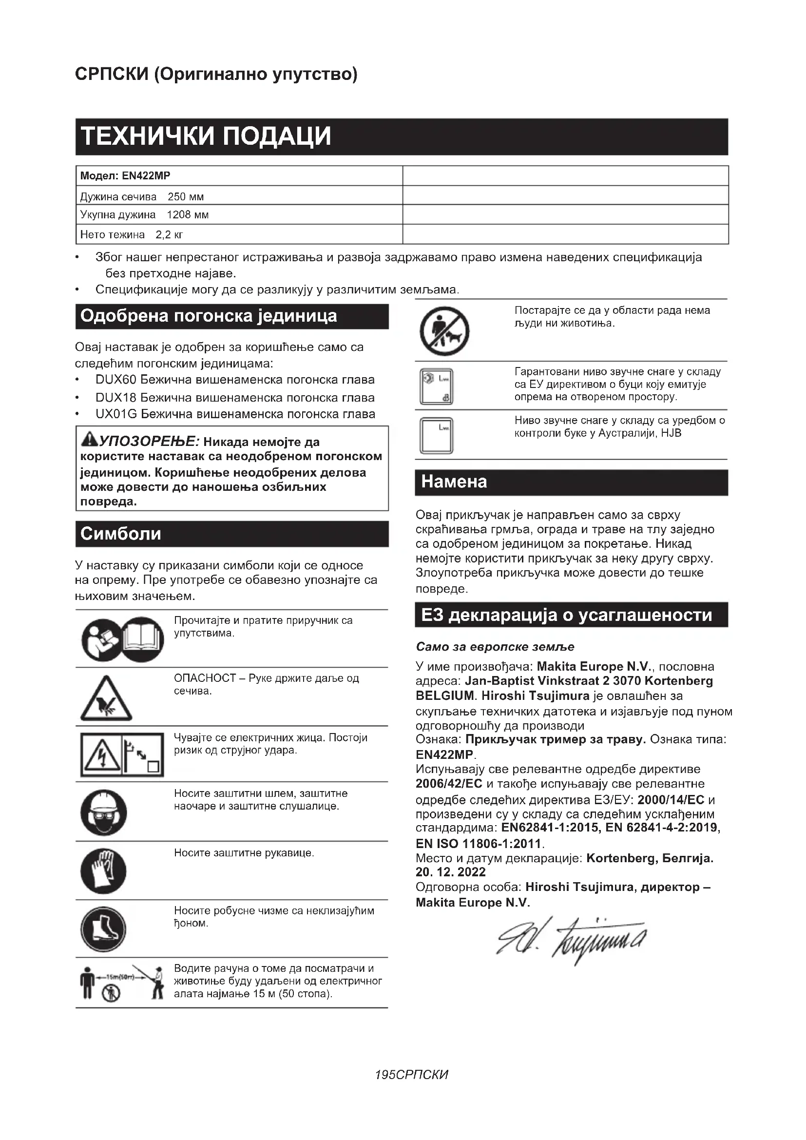 ЕЗ декларација о усаглашености Само за европске земље Уимепроизвођача:Makita Europe N.V.,пословна адреса:Jan-Baptist Vinkstraat 2 3070 Kortenberg BELGIUM. Hiroshi Tsujimuraјеовлашћенза скупљањетехничкихдатотекаиизјављујеподпуном одговорношћудапроизводи Ознака:Прикључак тример за траву.Ознакатипа: EN422MP. Испуњавајусверелевантнеодредбедирективе 2006/42/ECитакођеиспуњавајусверелевантне одредбеследећихдирективаЕЗ/ЕУ:2000/14/ECи произведенисуускладусаследећимусклађеним стандардима:EN62841-1:2015, EN 62841-4-2:2019, EN ISO 11806-1:2011. Местоидатумдекларације:Kortenberg, Белгија.