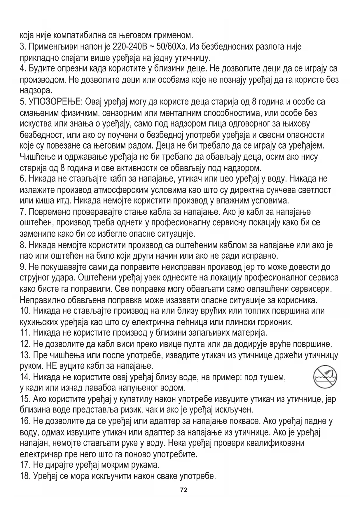 14. Никада не користите овај уређај близу воде, на пример: под тушем,