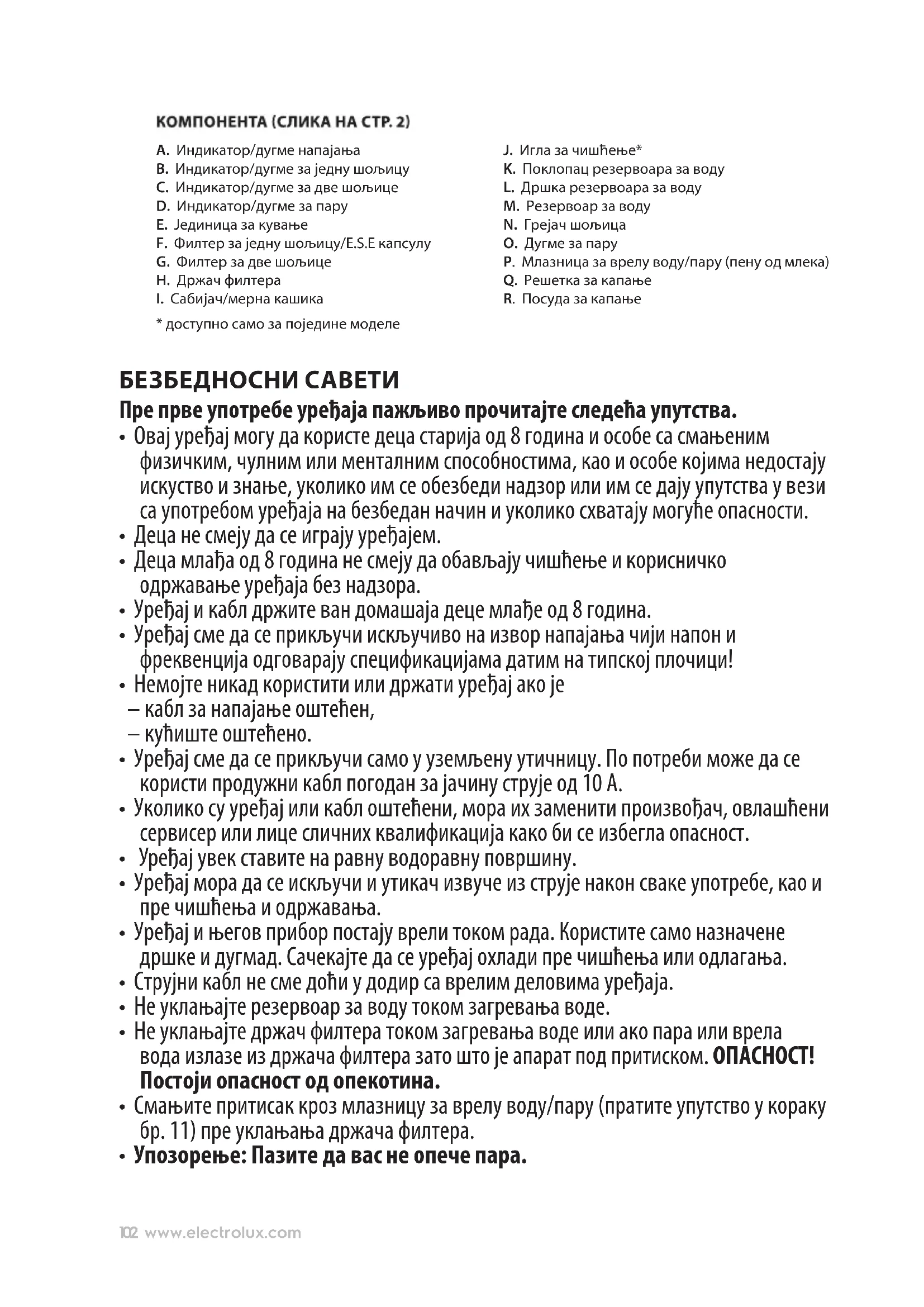 започели поступак кувања. НАПОМЕНА: Можда ћете чути како уређај ради при првом пумпању воде. То је нормално. Апарат тако избацује ваздух. Овај звук ће престати након 20-ак секунди.104 www.electrolux.com 4 По завршетку кувања, окрените држач филтера у смеру казаљки на сату да бисте га уклонили, а затим очистите филтер и посуду за капање. Уређај је сада спреман за рад. НАПОМЕНА: Уколико не користите уређај 20 минута, он ће се аутоматски искључити. Прављење еспреса 5 Ставите филтер за једну шољицу у држач филтера. Сипајте једну кашичицу кафе и притисните је користећи сабијач или ставите једну E.S.E капсулу у филтер. Еспресо се лакше припрема уколико користите E.S.E (Easy Serving Espresso) капсуле. Свака капсула садржи 7 грама кафе, која је измерена, унапред сабијена и херметички затворена између 2 танка слоја филтер-папира. 6 Да бисте причврстили филтер на јединицу за кување, окрените га супротно од смера казаљки на сату из положаја „INSERT” у положај „LOCK”. 7 Ставите загрејану шољицу на посуду за капање. Када у режиму „предгревање завршено”, дугмад и и непрекидно светли пуним интензитетом, притисните дугме да бисте започели поступак кувања. 8 Мало сачекајте и из апарата ће потећи врхунска кафа. Кад апарат заврши са радом, кафа је спремна. 9 Сада ставите филтер за две шољице. Притисните дугме . Скувајте 2 шољице еспреса истовремено. 10 НАПОМЕНА: Ако дугмад и почну убрзано да трепере, можете притиснути дугме или за прекид кувања или (корак бр. 11) 11 (корак бр. 10) можете покренути кување из почетка након што се бојлер уређаја охлади. Окрените дугме у положај и испустите врелу воду из млазнице за пару. Пумпа аутоматски прекида са радом када заврши хлађење. Окрените дугме у искључен положај и наставите са