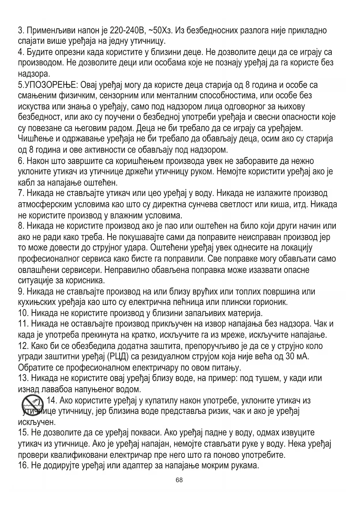 13. Никада не користите овај уређај близу воде, на пример: под тушем, у кади или
