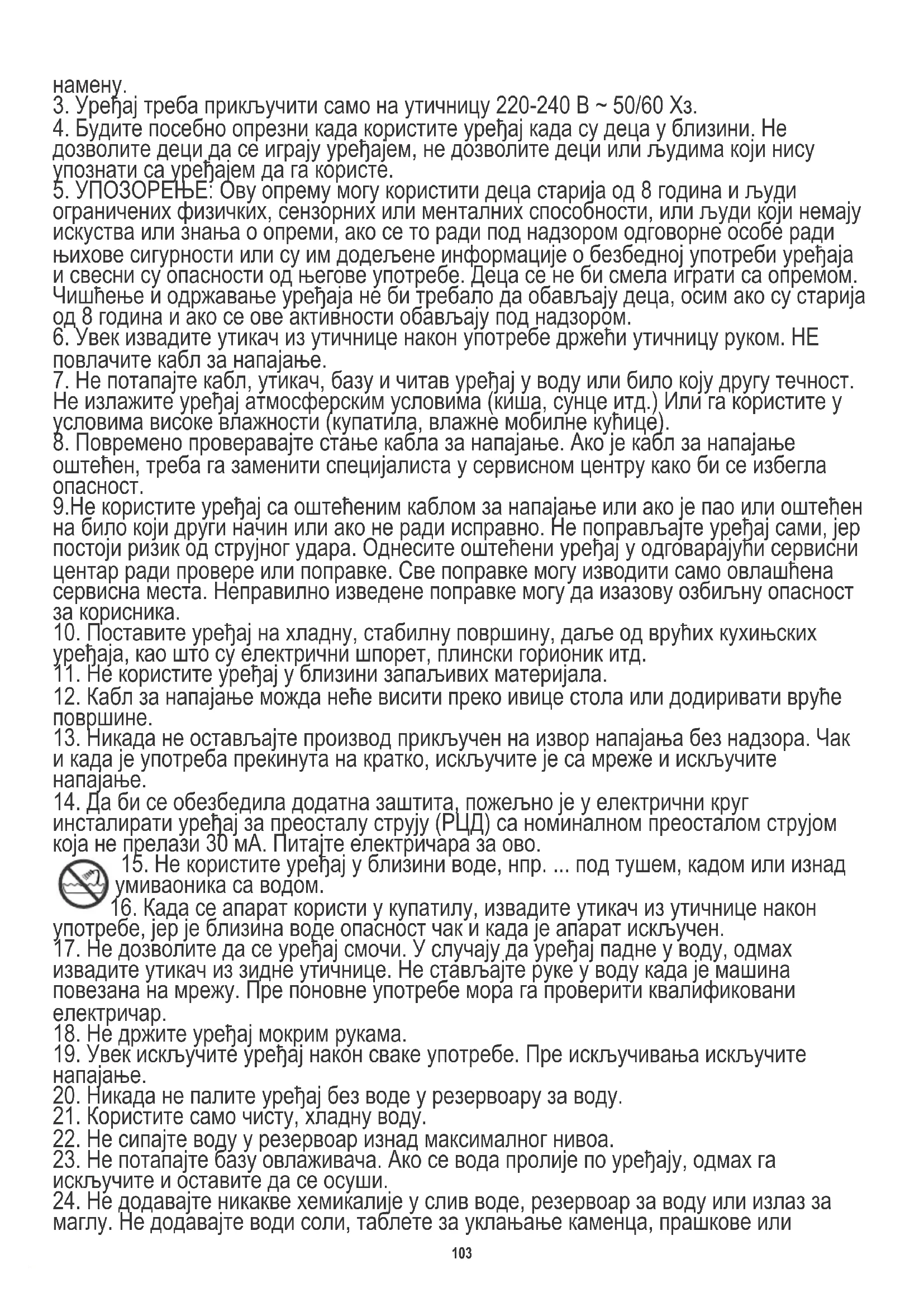 15. Не користите уређај у близини воде, нпр. ... под тушем, кадом или изнад