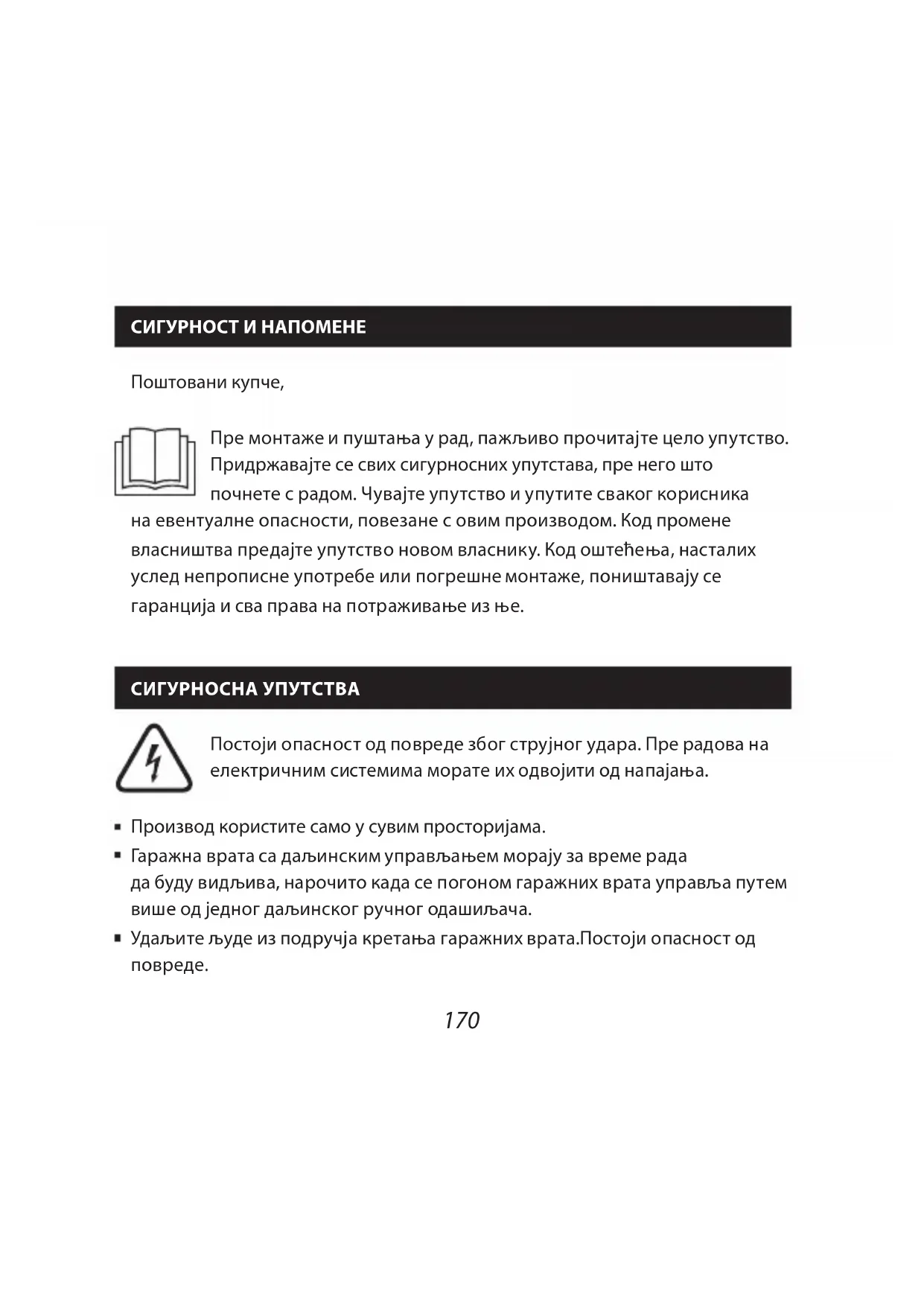 СИГУРНОСТ И НАПОМЕНЕ Поштовани купче, Пре монтаже и пуштања у рад, пажљиво прочитајте цело упутство Придржавајте се свих сигурносних упутстава, пре него што почнете с радом Чувајте упутство и упутите сваког корисника на евентуалне опасности, повезане с овим производом Код промене власништва предајте упутство новом власнику Код оштећења, насталих услед непрописне употребе или погрешне монтаже, поништавају се гаранција и сва права на потраживање из ње СИГУРНОСНА УПУТСТВА Постоји опасност од повреде због струјног удара Пре радова на електричним системима морате их одвојити од напајања Производ користите само у сувим просторијама Гаражна врата са даљинским управљањем морају за време рада да буду видљива, нарочито када се погоном гаражних врата управља путем више од једног даљинског ручног одашиљача Удаљите људе из подручја кретања гаражних вратаПостоји опасност од