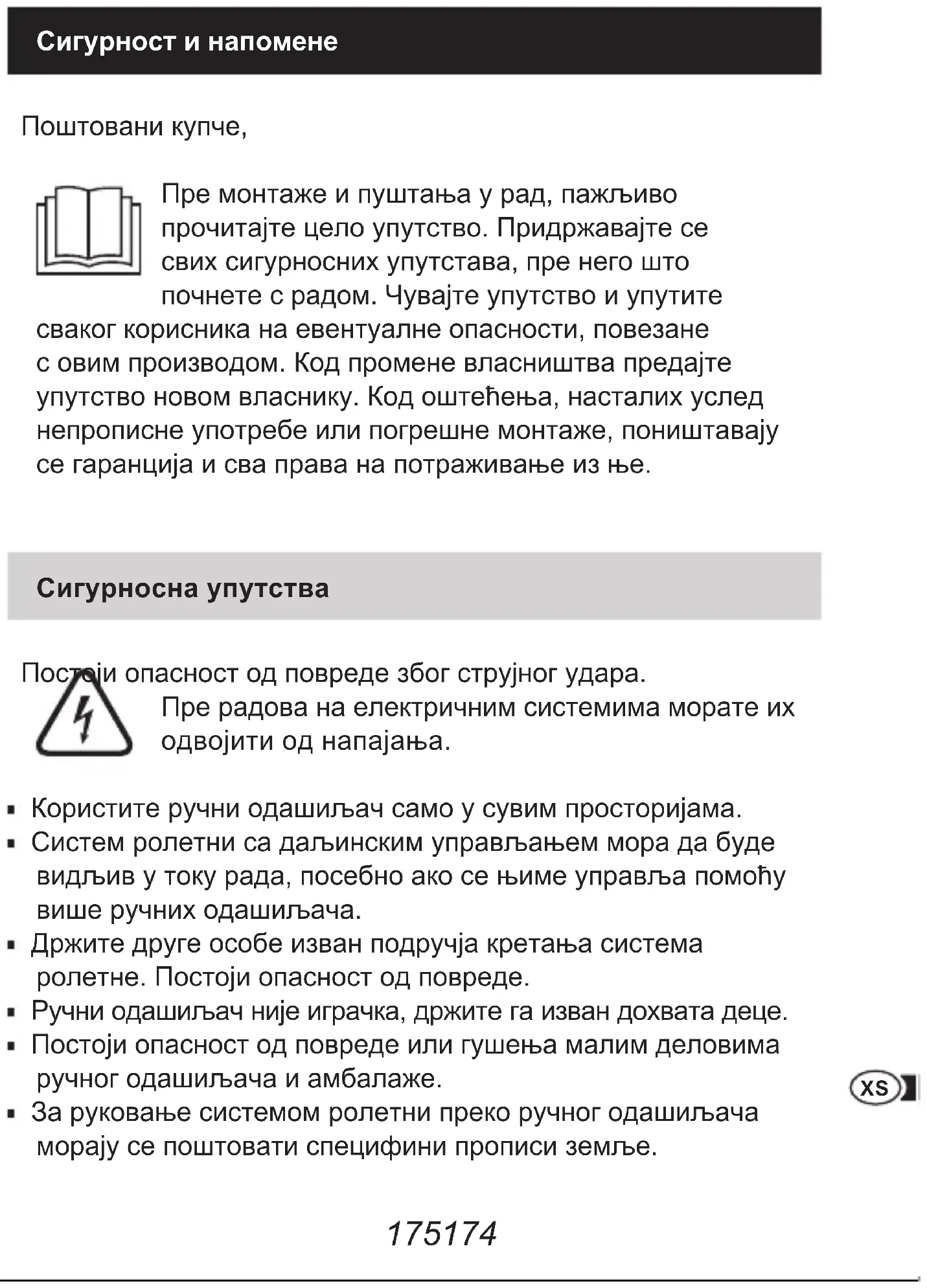 Сигурност и напомене Поштовани купче, Пре монтаже и пуштања у рад, пажљиво прочитајте цело упутство. Придржавајте се свих сигурносних упутстава, пре него што почнете с радом. Чувајте упутство и упутите сваког корисника на евентуалне опасности, повезане с овим производом. Код промене власништва предајте упутство новом власнику. Код оштећења, насталих услед непрописне употребе или погрешне монтаже, поништавају се гаранција и сва права на потраживање из ње. Сигурносна упутства Постоји опасност од повреде због струјног удара. Пре радова на електричним системима морате их одвојити од напајања. Користите ручни одашиљач само у сувим просторијама. Систем ролетни са даљинским управљањем мора да буде видљив у току рада, посебно ако се њиме управља помоћу више ручних одашиљача. Држите друге особе изван подручја кретања система ролетне. Постоји опасност од повреде. Ручни одашиљач није играчка, држите га изван дохвата деце. Постоји опасност од повреде или гушења малим деловима ручног одашиљача и амбалаже. За руковање системом ролетни преко ручног одашиљача морају се поштовати специфини прописи земље.176 Замените батерије само истим типом, LR03 / AAA. Немојте водити цевасти мотор преко крајњих положаја. Опасност од оштећења! Изјава CE и усклађеност Производ испуњава важеће захтеве европске и националних директива. Усклађеност је доказана, а одговарајућа изјава о усаглашености ЕЗ је приложена уз производ или може да се потражи у служби за подршку корисницима. Адреса за е-пошту: service.int@schellenberg.de Не бацајте с кућним отпадом! Овај производ се може рециклирати, а можете га предати и на откупним или сабирним пунктовима за електрични кућни отпад. Директива о РиТТО 1999/5/EЗ Предвиђена примена Повезујте ручни одашиљач само на уређаје који су одобрени од стране произвођача. Друга употреба ручног одашиљача или употреба која превазилази предвиђену примену сматра се непрописном. Ручни одашиљач не сме да се користи у подручјима с високим ризиком или ометањем трећих (нпр. болнице, аеродроми или слични објекти).177176