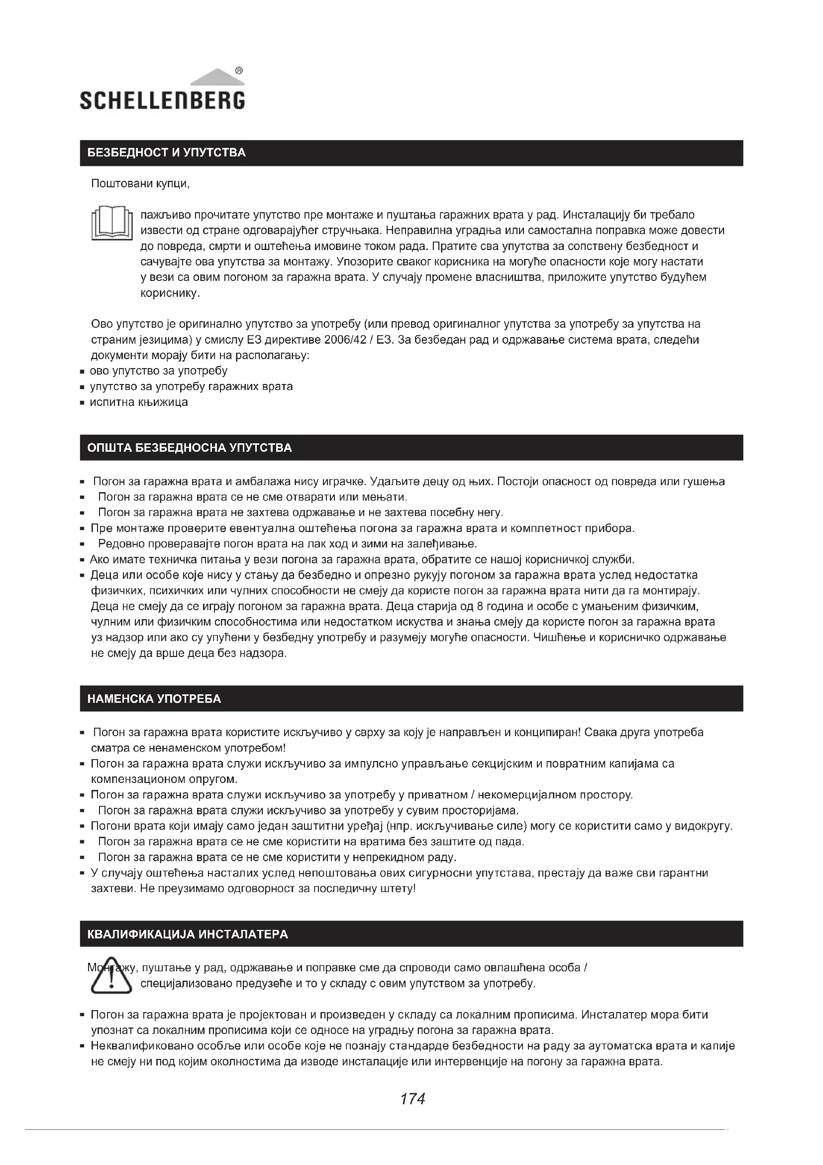 Ово упутство је оригинално упутство за употребу (или превод оригиналног упутства за употребу за упутства на страним језицима) у смислу ЕЗ директиве 2006/42 / ЕЗ. За безбедан рад и одржавање система врата, следећи документи морају бити на располагању: ово упутство за употребу упутство за употребу гаражних врата испитна књижица ОПШТА БЕЗБЕДНОСНА УПУТСТВА Погон за гаражна врата и амбалажа нису играчке. Удаљите децу од њих. Постоји опасност од повреда или гушења Погон за гаражна врата се не сме отварати или мењати. Погон за гаражна врата не захтева одржавање и не захтева посебну негу. Пре монтаже проверите евентуална оштећења погона за гаражна врата и комплетност прибора. Редовно проверавајте погон врата на лак ход и зими на залеђивање. Ако имате техничка питања у вези погона за гаражна врата, обратите се нашој корисничкој служби. Деца или особе које нису у стању да безбедно и опрезно рукују погоном за гаражна врата услед недостатка физичких, психичких или чулних способности не смеју да користе погон за гаражна врата нити да га монтирају. Деца не смеју да се играју погоном за гаражна врата. Деца старија од 8 година и особе с умањеним физичким, чулним или физичким способностима или недостатком искуства и знања смеју да користе погон за гаражна врата уз надзор или ако су упућени у безбедну употребу и разумеју могуће опасности. Чишћење и корисничко одржавање не смеју да врше деца без надзора. НАМЕНСКА УПОТРЕБА Погон за гаражна врата користите искључиво у сврху за коју је направљен и конципиран! Свака друга употреба сматра се ненаменском употребом! Погон за гаражна врата служи искључиво за импулсно управљање секцијским и повратним капијама са компензационом опругом. Погон за гаражна врата служи искључиво за употребу у приватном / некомерцијалном простору. Погон за гаражна врата служи искључиво за употребу у сувим просторијама. Погони врата који имају само један заштитни уређај (нпр. искључивање силе) могу се користити само у видокругу. Погон за гаражна врата се не сме користити на вратима без заштите од пада. Погон за гаражна врата се не сме користити у непрекидном раду. У случају оштећења насталих услед непоштовања ових сигурносни упутстава, престају да важе сви гарантни захтеви. Не преузимамо одговорност за последичну штету! КВАЛИФИКАЦИЈА ИНСТАЛАТЕРА Монтажу, пуштање у рад, одржавање и поправке сме да спроводи само овлашћена особа / специјализовано предузеће и то у складу с овим упутством за употребу. Погон за гаражна врата је пројектован и произведен у складу са локалним прописима. Инсталатер мора бити упознат са локалним прописима који се односе на уградњу погона за гаражна врата. Неквалификовано особље или особе које не познају стандарде безбедности на раду за аутоматска врата и капије не смеју ни под којим околностима да изводе инсталације или интервенције на погону за гаражна врата.175