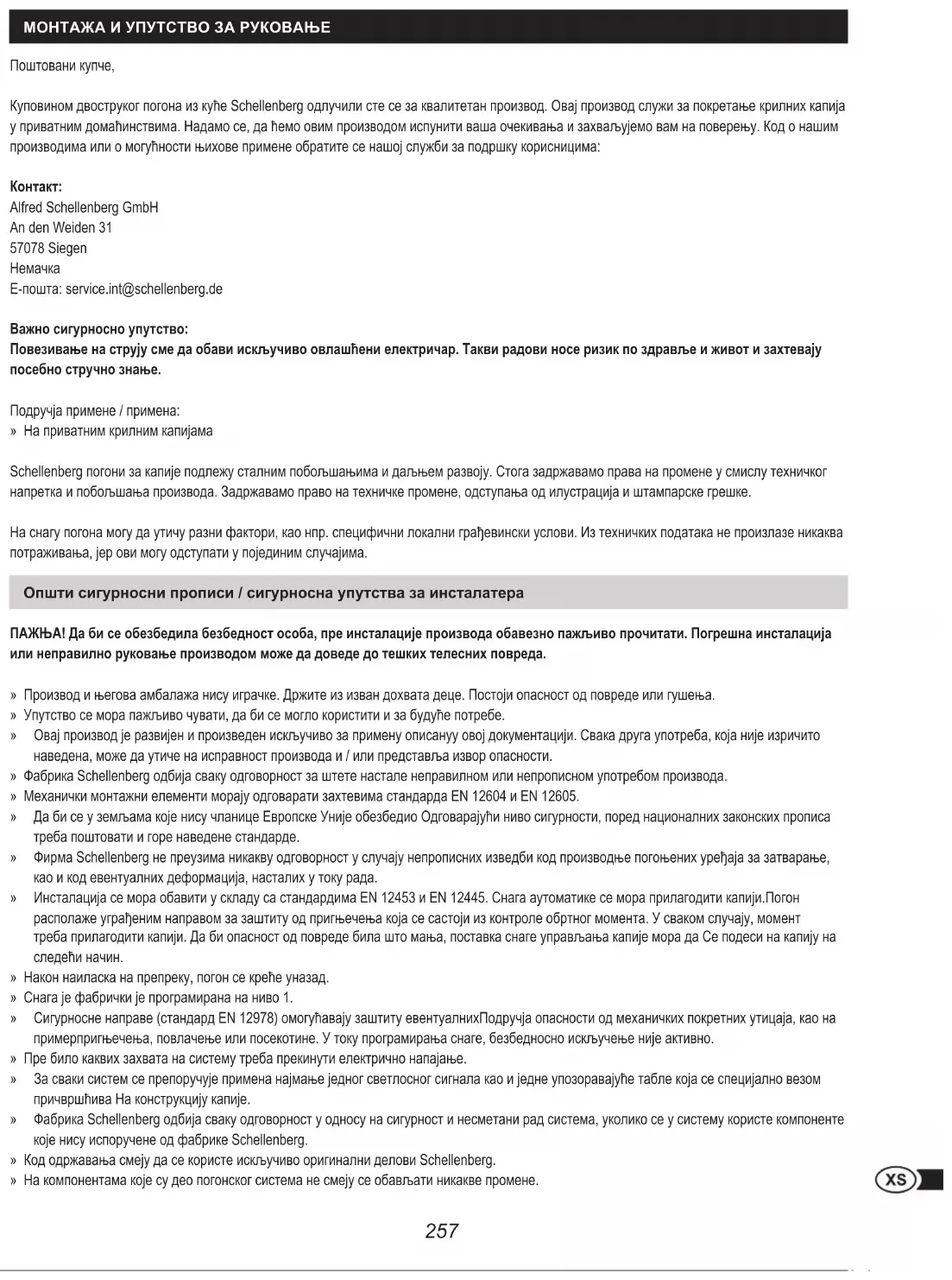 Е-пошта: serviceint@schellenbergde Важно сигурносно упутство: Повезивање на струју сме да обави искључиво овлашћени електричар. Такви радови носе ризик по здравље и живот и захтевају посебно стручно знање. Подручја примене / примена: » На приватним крилним капијама Schellenberg погони за капије подлежу сталним побољшањима и даљњем развоју Стога задржавамо права на промене у смислу техничког напретка и побољшања производа Задржавамо право на техничке промене, одступања од илустрација и штампарске грешке На снагу погона могу да утичу разни фактори, као нпр специфични локални грађевински услови Из техничких података не произлазе никаква потраживања, јер ови могу одступати у појединим случајима Општи сигурносни прописи / сигурносна упутства за инсталатера ПАЖЊА! Да би се обезбедила безбедност особа, пре инсталације производа обавезно пажљиво прочитати. Погрешна инсталација или неправилно руковање производом може да доведе до тешких телесних повреда. » Производ и његова амбалажа нису играчке Држите из изван дохвата деце Постоји опасност од повреде или гушења » Упутство се мора пажљиво чувати, да би се могло користити и за будуће потребе » Овај производ је развијен и произведен искључиво за примену описануу овој документацији Свака друга употреба, која није изричито наведена, може да утиче на исправност производа и / или представља извор опасности » Фабрика Schellenberg одбија сваку одговорност за штете настале неправилном или непрописном употребом производа » Механички монтажни елементи морају одговарати захтевима стандарда EN 12604 и EN 12605 » Да би се у земљама које нису чланице Европске Уније обезбедио Одговарајући ниво сигурности, поред националних законских прописа треба поштовати и горе наведене стандарде » Фирма Schellenberg не преузима никакву одговорност у случају непрописних изведби код производње погоњених уређаја за затварање, као и код евентуалних деформација, насталих у току рада » Инсталација се мора обавити у складу са стандардима EN 12453 и EN 12445 Снага аутоматике се мора прилагодити капијиПогон располаже уграђеним направом за заштиту од пригњечења која се састоји из контроле обртног момента У сваком случају, момент треба прилагодити капији Да би опасност од повреде била што мања, поставка снаге управљања капије мора да Се подеси на капију на следећи начин » Након наиласка на препреку, погон се креће уназад » Снага је фабрички је програмирана на ниво 1 » Сигурносне направе (стандард EN 12978) омогућавају заштиту евентуалнихПодручја опасности од механичких покретних утицаја, као на примерпригњечења, повлачење или посекотине У току програмирања снаге, безбедносно искључење није активно » Пре било каквих захвата на систему треба прекинути електрично напајање » За сваки систем се препоручује примена најмање једног светлосног сигнала као и једне упозоравајуће табле која се специјално везом причвршћива На конструкцију капије » Фабрика Schellenberg одбија сваку одговорност у односу на сигурност и несметани рад система, уколико се у систему користе компоненте које нису испоручене од фабрике Schellenberg » Код одржавања смеју да се користе искључиво оригинални делови Schellenberg » На компонентама које су део погонског система не смеју се обављати никакве промене МОНТАЖА И УПУТСТВО ЗА РУКОВАЊЕ258 » Инсталатер мора да пренесе све информације у односу на ручно 
