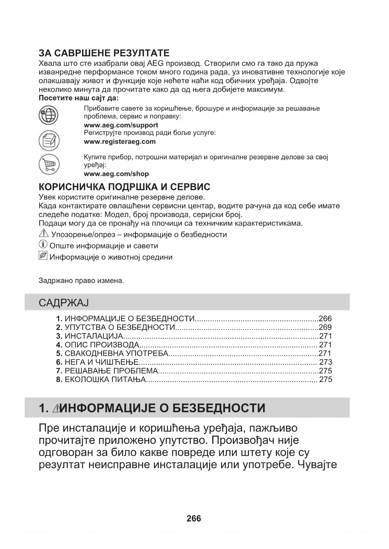 Ricikloni materialet me simbolin . Vendoseni ambalazhin te kontejnerët e riciklimit nëse ka. Ndihmoni në mbrojtjen e mjedisit dhe shëndetit të njerëzve dhe në riciklimin e mbetjeve të pajisjeve elektrike dhe elektronike. Mos hidhni pajisjet e shënuara me simbolin e mbeturinave shtëpiake. Ktheni produktin në pikën lokale të riciklimit ose kontaktoni me zyrën komunale. 265ЗА САВРШЕНЕ РЕЗУЛТАТЕ Хвала што сте изабрали овај AEG производ. Створили смо га тако да пружаизванредне перформансе током много година рада, уз иновативне технологије којеолакшавају живот и функције које нећете наћи код обичних уређаја. Одвојтенеколико минута да прочитате како да од њега добијете максимум.Посетите наш сајт да:Прибавите савете за коришћење, брошуре и информације за решавањепроблема, сервис и поправку:www.aeg.com/supportРегиструјте производ ради боље услуге:www.registeraeg.comКупите прибор, потрошни материјал и оригиналне резервне делове за својуређај:www.aeg.com/shop КОРИСНИЧКА ПОДРШКА И СЕРВИС Увек користите оригиналне резервне делове.Када контактирате овлашћени сервисни центар, водите рачуна да код себе иматеследеће податке: Модел, број производа, серијски број.Подаци могу да се пронађу на плочици са техничким карактеристикама. Упозорење/опрез – информације о безбедности Опште информације и савети Информације о животној срединиЗадржано право измена. 1. ИНФОРМАЦИЈЕ О БЕЗБЕДНОСТИ.........................................................2662. УПУТСТВА О БЕЗБЕДНОСТИ..................................................................269