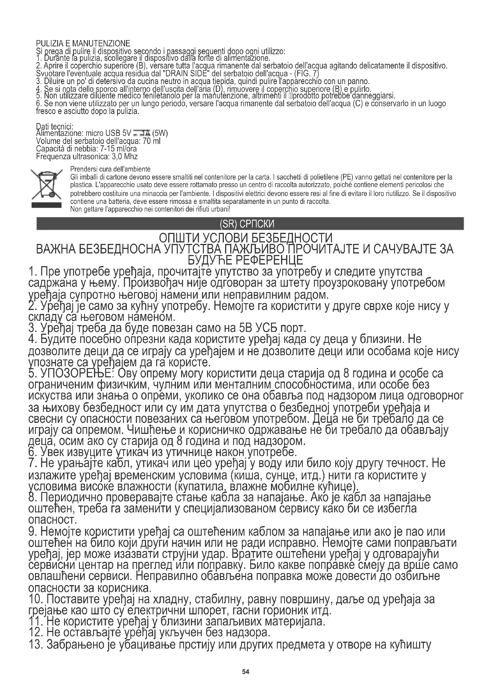 хладном месту. Технички подаци: Напајање: микро УСБ 5В 1А (5В) Запремина резервоара за воду: 70 мл Капацитет магле: 7-15мл/сат Ултразвучна фреквенција: 3.0МХз За заштиту животне средине: молимо вас да одвојите картонске кутије и пластичне кесе и одложите их у одговарајуће канте за смеће. Коришћени уређај треба да буде испоручен на наменске сакупљане тачке због оштрих компоненти, што може утицати на животну средину. Немојте одлагати овај уређај у заједничку корпу за отпатке. (DK) DANSKI