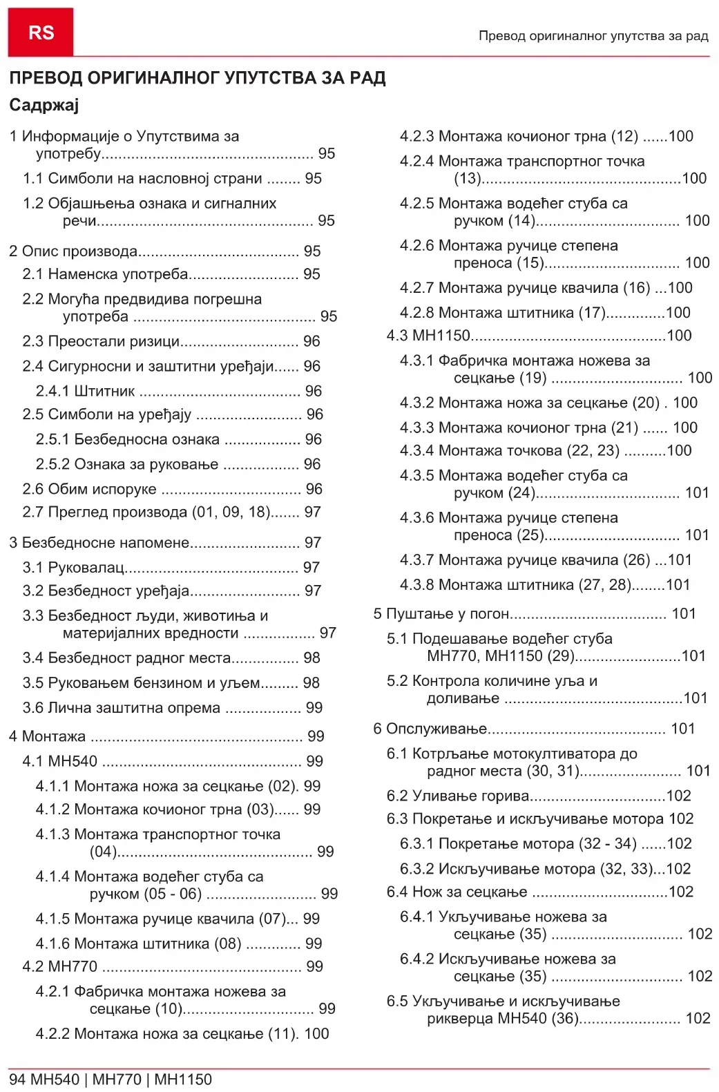 Уређај није предвиђен ни за комерциајлну употребу у јавним парковима и спортским објектима ни за употребу у пољопривреди и шумарству.RS 96 MH540 | MH770 | MH1150 Опис производа Пре свега водите рачуна о следећем: