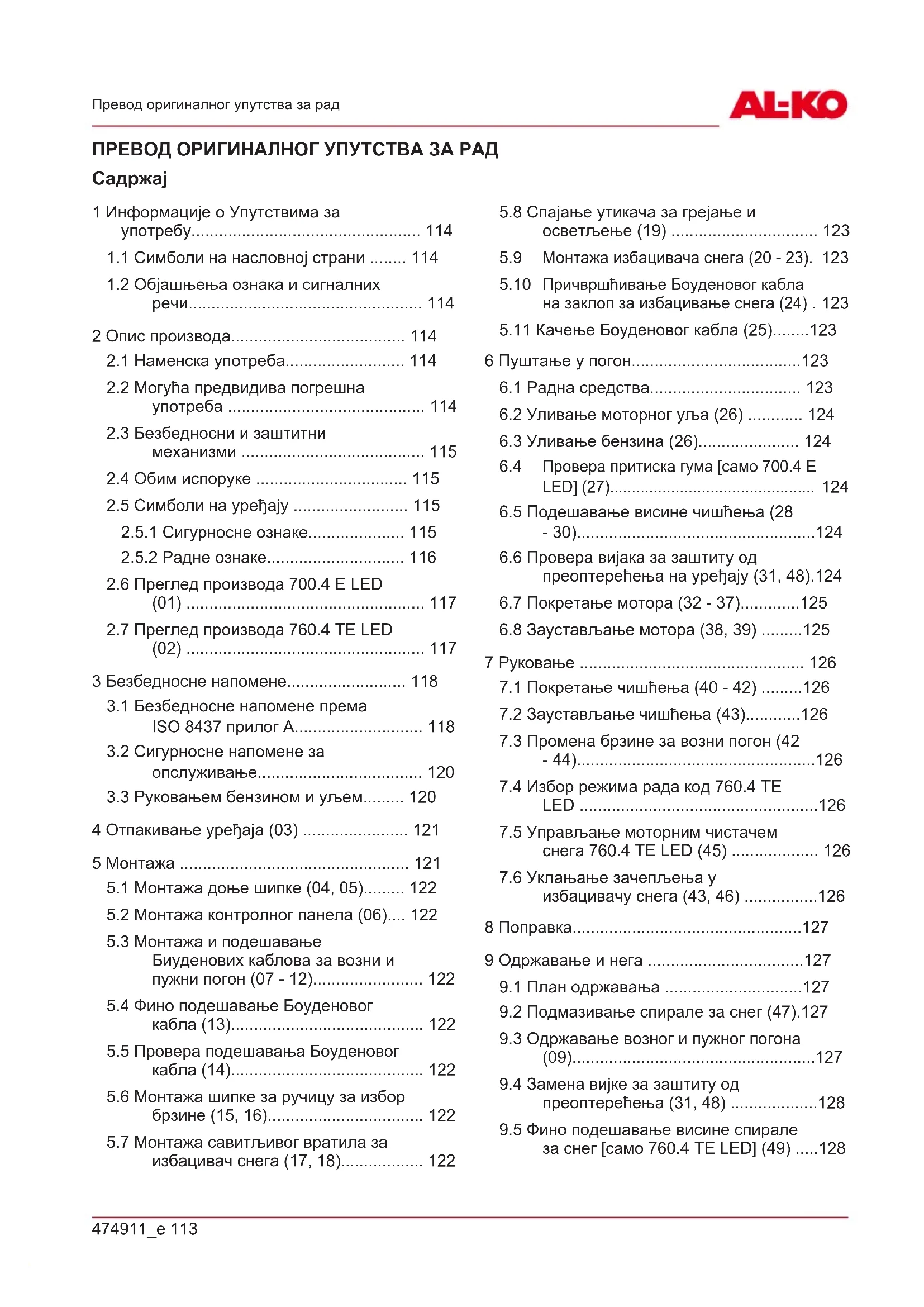 за снег [само 760.4 TE LED] (49) .....128RS 114 SnowLine 700.4 E LED | SnowLine 760.4 TE LED Информације о Упутствима за употребу