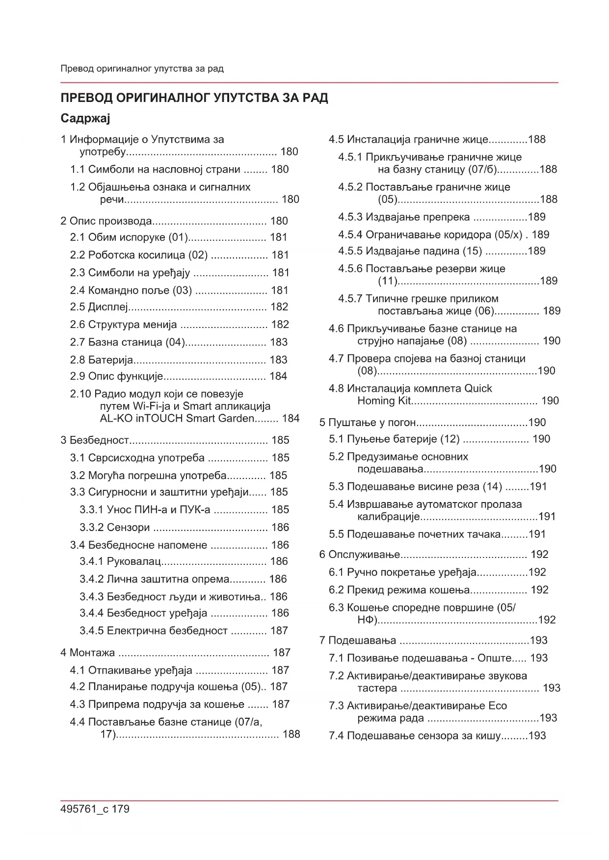 14 СЛУЖБА ЗА КОРИСНИКЕ/СЕРВИС Код питања у вези са гаранцијом, поправком или резервним деловима се обратите вашем најближем AL-KOсервису. Њега ћете наћи на интернету под следећом адресом: www.alko-garden.com/service-contacts Додатне информације о резервним деловима можете да пронађете на: www.alko-garden.com/spareparts 15 ИНФОРМАЦИЈЕ О ИЗЈАВЕ О УСКЛАЂЕНОСТИ Овим под пуном одговорношћу изјављујемо, да овај производ у облику којим се продаје на тржишту испуњава захтеве хармонизованих ЕУ-директива, безбедносних стандарда ЕУ и стандарда који су специфични за овај производ. Изјава о усклађености је део упутства за употребу и приложена је машини. 16 ГАРАНЦИЈА Евентуалне грешке у материјалу или производњи на уређају поправићемо за време законског рока застаре права на гаранцију за недостатке према сопственом избору поправљањем или заменом. Рок застаре одређује се према праву државе у којој је уређај купљен. Наша гарантна изјава важи само у случају: