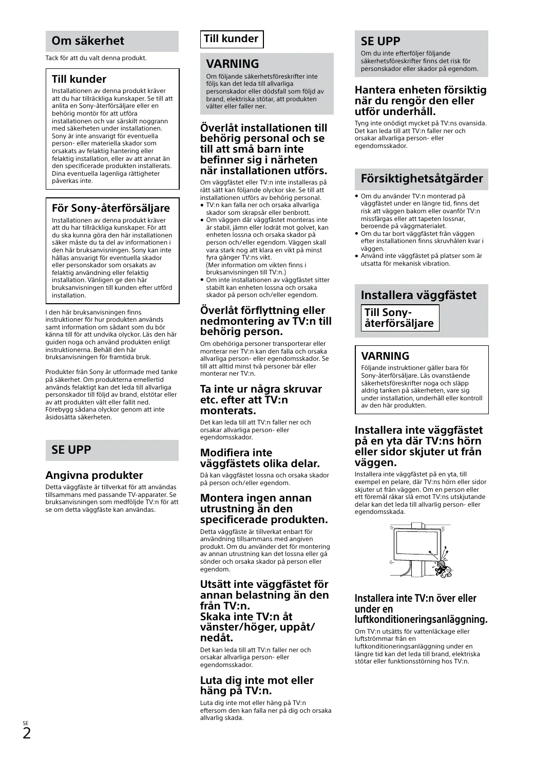 Téléchargez la notice de votre TV-väggfäste au format PDF gratuitement ! Retrouvez votre notice SU-WL450 - SONY et reprennez votre appareil électronique en main. Sur cette page sont publiés tous les documents nécessaires à l'utilisation de votre appareil SU-WL450 de la marque SONY.