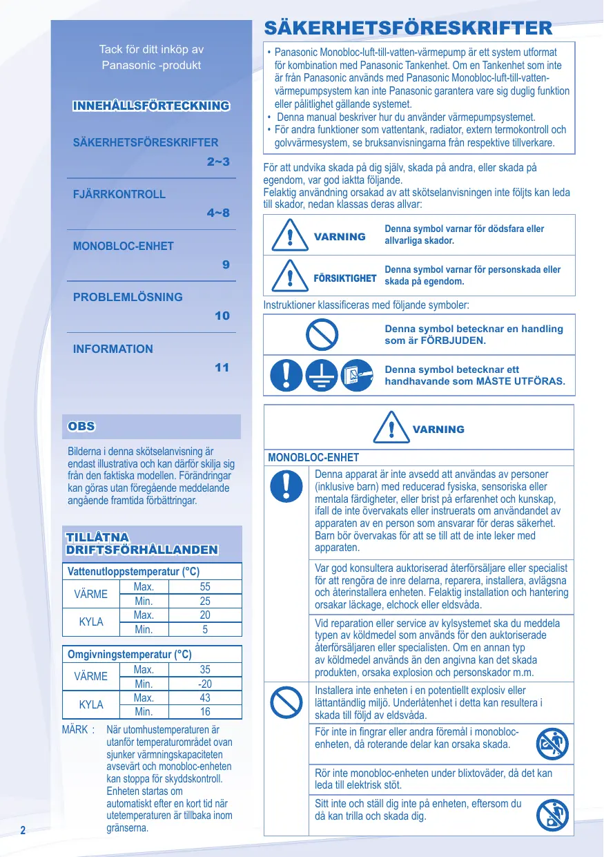 • Panasonic Monobloc-luft-till-vatten-värmepump är ett system utformat för kombination med Panasonic Tankenhet. Om en Tankenhet som inte är från Panasonic används med Panasonic Monobloc-luft-till-vattenvärmepumpsystem kan inte Panasonic garantera vare sig duglig funktion eller pålitlighet gällande systemet. • Denna manual beskriver hur du använder värmepumpsystemet. • För andra funktioner som vattentank, radiator, extern termokontroll och golvvärmesystem, se bruksanvisningarna från respektive tillverkare.
