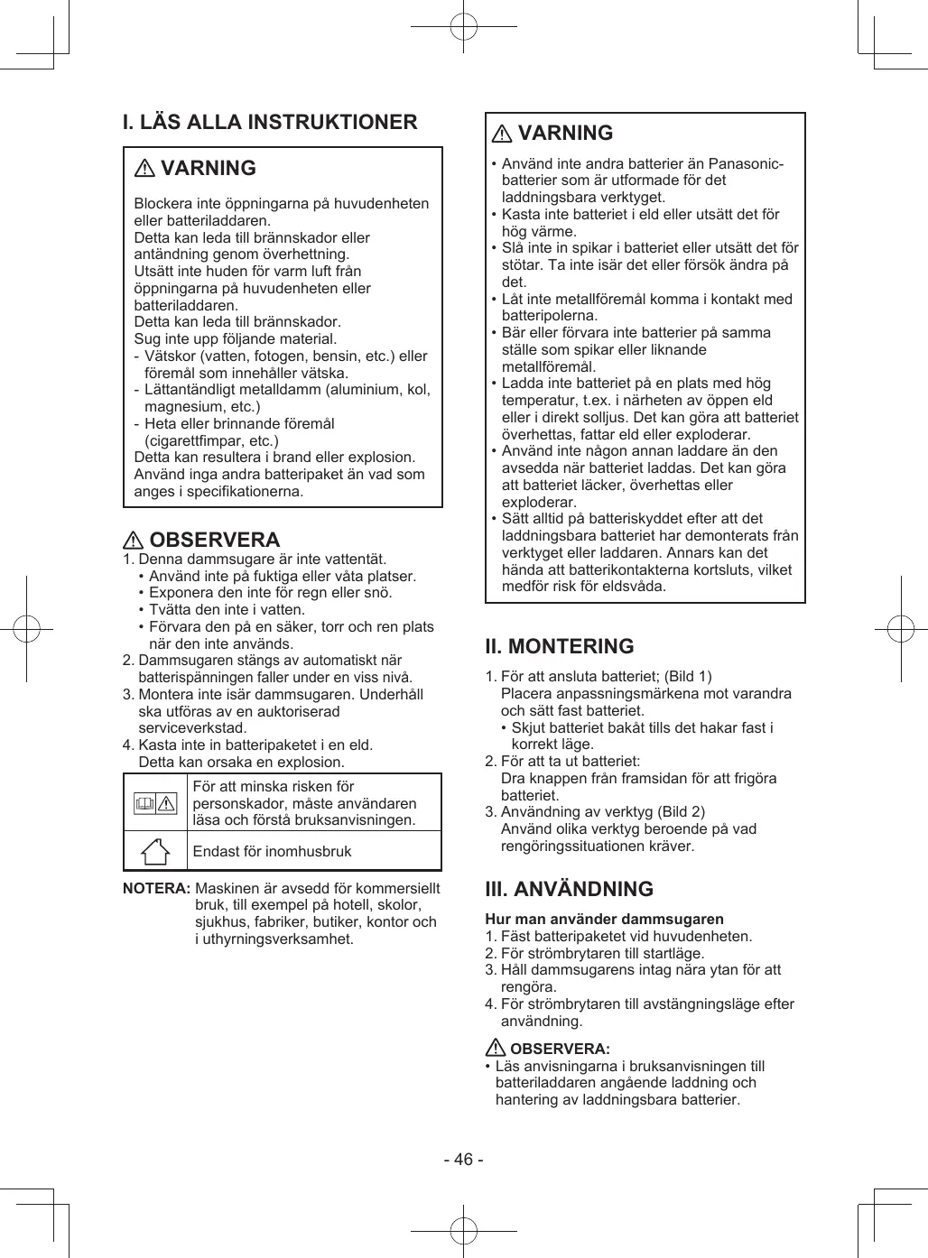 I. LÄS ALLA INSTRUKTIONER VARNING • Använd inte andra batterier än Panasonicbatterier som är utformade för det laddningsbara verktyget. • Kasta inte batteriet i eld eller utsätt det för hög värme. • Slå inte in spikar i batteriet eller utsätt det för stötar. Ta inte isär det eller försök ändra på det. • Låt inte metallföremål komma i kontakt med batteripolerna. • Bär eller förvara inte batterier på samma ställe som spikar eller liknande metallföremål. • Ladda inte batteriet på en plats med hög temperatur, t.ex. i närheten av öppen eld eller i direkt solljus. Det kan göra att batteriet överhettas, fattar eld eller exploderar. • Använd inte någon annan laddare än den avsedda när batteriet laddas. Det kan göra att batteriet läcker, överhettas eller exploderar. • Sätt alltid på batteriskyddet efter att det laddningsbara batteriet har demonterats från verktyget eller laddaren. Annars kan det hända att batterikontakterna kortsluts, vilket medför risk för eldsvåda.