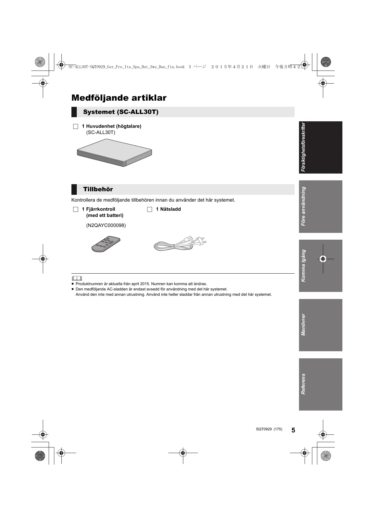 Före användning Försiktighetsföreskrifter Systemet (SC-ALL30T) ∏ 1 Huvudenhet (högtalare) (SC-ALL30T) Före användning Tillbehör Kontrollera de medföljande tillbehören innan du använder det här systemet. ∏ 1 Fjärrkontroll (med ett batteri) ∏ 1 Nätsladd Komma igång (N2QAYC000098) Referens Manövrer ≥ Produktnumren är aktuella från april 2015. Numren kan komma att ändras. ≥ Den medföljande AC-sladden är endast avsedd för användning med det här systemet. Använd den inte med annan utrustning. Använd inte heller sladdar från annan utrustning med det här systemet. SQT0929 (175)