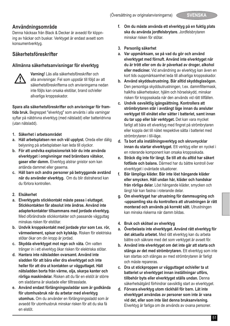 (Översättning av originalanvisningarna) Användningsområde Denna häcksax från Black & Decker är avsedd för klippning av häckar och buskar. Verktyget är endast avsett som konsumentverktyg. Säkerhetsföreskrifter Allmänna säkerhetsanvisningar för elverktyg
