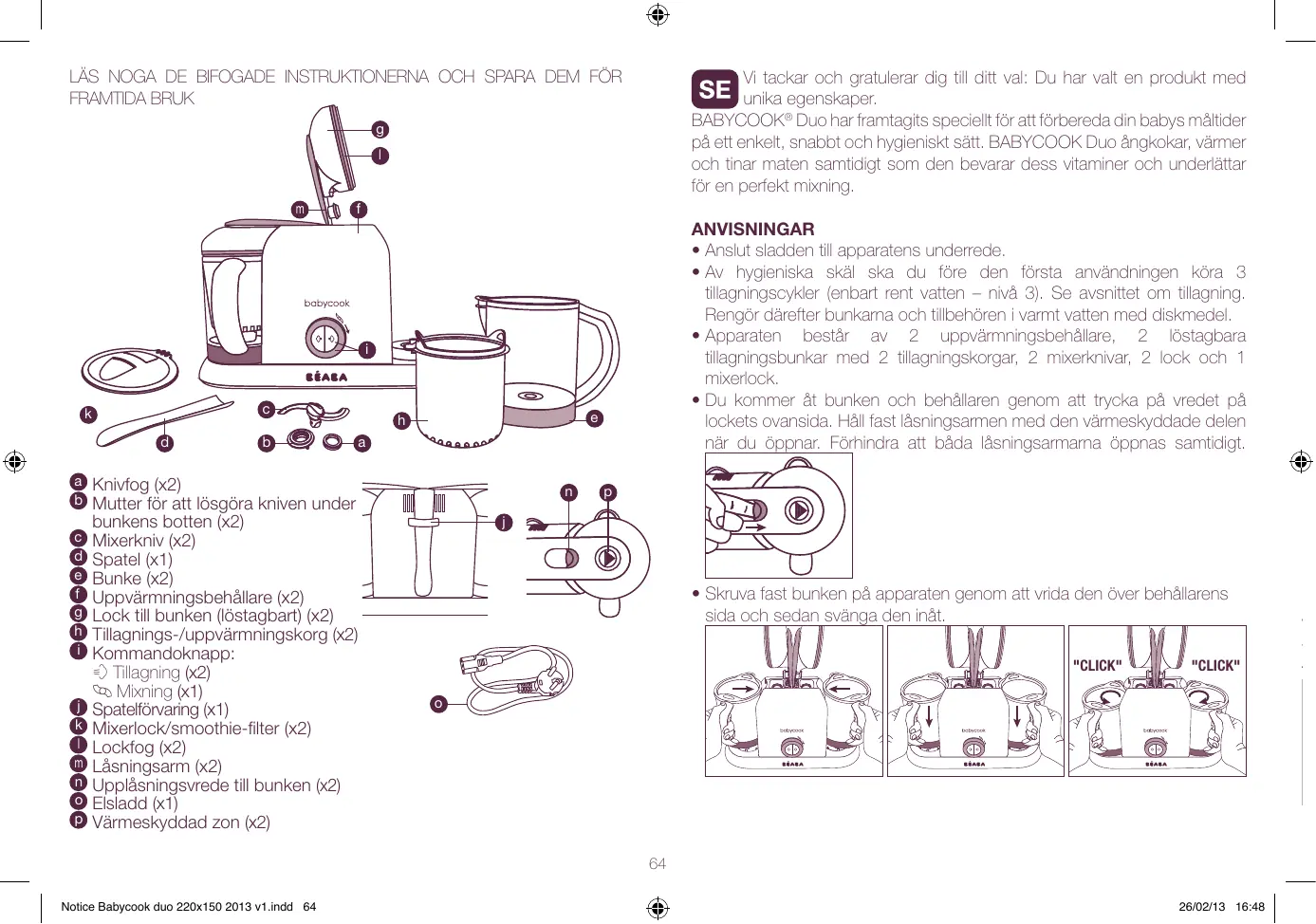 Sätt inte fast eller ta loss locket vid stängd låsarm. 67 Notice Babycook duo 220x150 2013 v1.indd 67