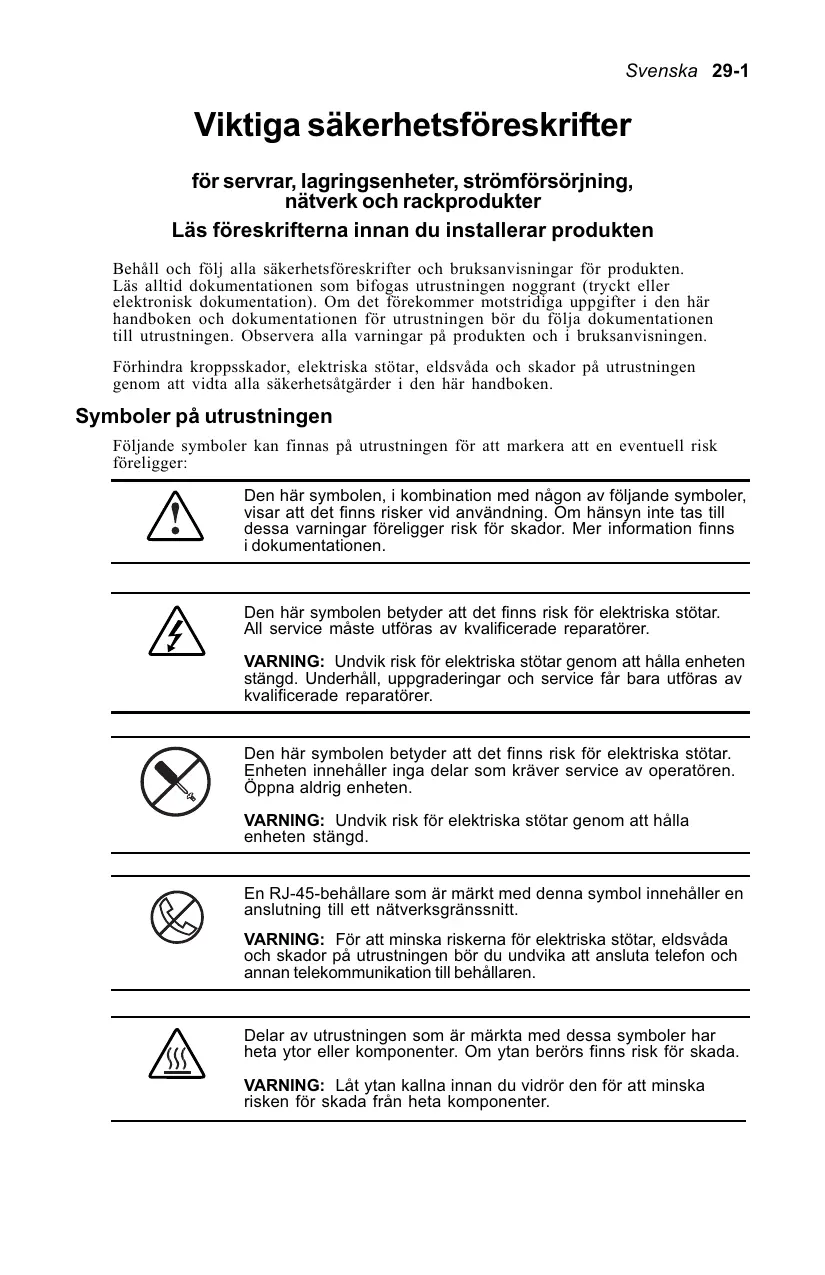 Om produkten erhåller skador som kräver service, drar du ur nätsladden och kontaktar en auktoriserad HP-servicepartner. Följande är exempel på skador som kräver service: q Nätsladd, förlängningssladd eller kontakt är trasig. q Vätska har spillts eller föremål har tappats i produkten. q Produkten har utsatts för regn eller vatten. q Produkten har tappats eller skadats. q Produkten fungerar inte normalt när du följer bruksanvisningen instructions. Så här minskar du risken för personskador och skador på utrustningen: q Placera inte produkten i närheten av element, värmeregulatorer, spisar, förstärkare eller andra apparater som alstrar värme. q Använd aldrig produkten på en våt plats. q För aldrig in föremål genom öppningar i produkten. q Var försiktig när du flyttar produkter på hjul. Undvik snabba stopp och ojämna ytor. q Använd endast produkten med godkänd HP-utrustning. q Vrid ned volymen innan du använder hörlurar eller andra ljudenheter. Föreskrifter för underhåll och service av Enterprise-produkter För att minska risken för elektriska stötar och skador på utrustningen när du installerar, underhåller och utför service på Enterprise-produkter bör du följa dessa föreskrifter: ■ Vissa Enterprise-produkter innehåller strömförsörjning som kan skapa farliga spänningsnivåer. Kontrollera i den medföljande dokumentationen om produkten innehåller sådan strömförsörjning. Installationen av interna alternativ och rutinmässig(t) underhåll och service bör utföras av en person som känner till procedurer, åtgärder och faror vid arbete på utrustning med farliga spänningsnivåer. ■ Låt produkten svalna innan du tar bort höljen och vidrör komponenter inuti. ■ Använd inte ledande verktyg som kan överbrygga strömförande delar. ■ Ta av dig klocka, ringar och löst hängande smycken när du arbetar i Hot Plugområden vid en strömförande server eller lagringsprodukt. ■ Försök inte öppna säkerhetsförreglingar (där sådana finns). ■ Dörrarna till PCI Hot Plug ger tillgång till farliga strömkretsar. q Dörrarna ska vara låsta under normaldrift -ellorq Servern ska vara installerad på en plats med kontrollerad åtkomst så att enbart kvalificerad personal har tillgång till servern. ■ Stäng av utrustningen och koppla ur all nätsladdar innan du tar bort höljen till områden som inte är Hot Plug. ■ Byt inte ut komponenter som inte är Hot Plug med ström inkopplad till produkten. Stäng först av den och dra ur alla nätsladdar. Svenska 29-3