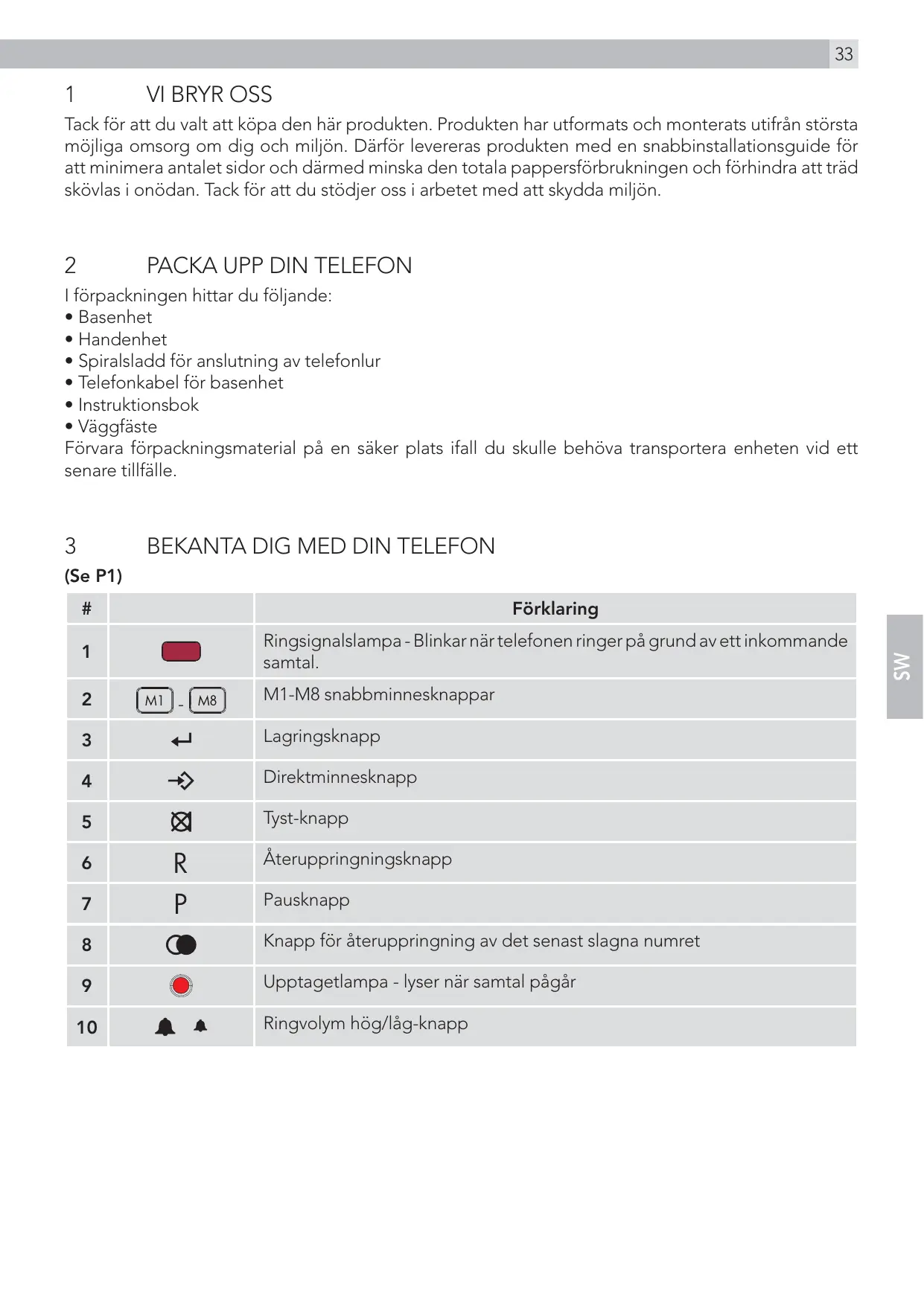I förpackningen hittar du följande: tBasenhet tHandenhet tSpiralsladd för anslutning av telefonlur tTelefonkabel för basenhet tInstruktionsbok tVäggfäste Förvara förpackningsmaterial på en säker plats ifall du skulle behöva transportera enheten vid ett senare tillfälle.
