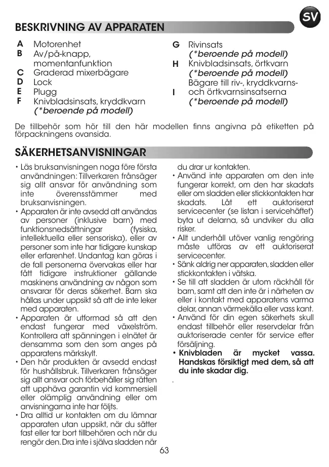 • Placez le blender sur un plan de travail stable, résistant à la chaleur, propre et sec. • Ne laissez pas pendre vos cheveux, un foulard, une cravate etc. au dessus du bol ou de ses accessoires pendant le fonctionnement de l’appareil. • N’utilisez pas le blender en plein air. • N’enlevez pas le couvercle (D) avant l’arrêt complet des lames. • N’utilisez jamais cet appareil pour mélanger ou mixer d’autres éléments que des ingrédients alimentaires.