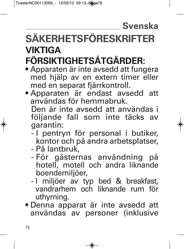ToasterNC00113269_- 12/05/12 09:13 Page77 barn) som inte klarar av att hantera elektrisk utrustning, eller av personer utan erfarenhet eller kännedom, förutom om de har erhållit, genom en person ansvarig för deras säkerhet, en övervakning eller på förhand fått anvisningar angående apparatens användning.