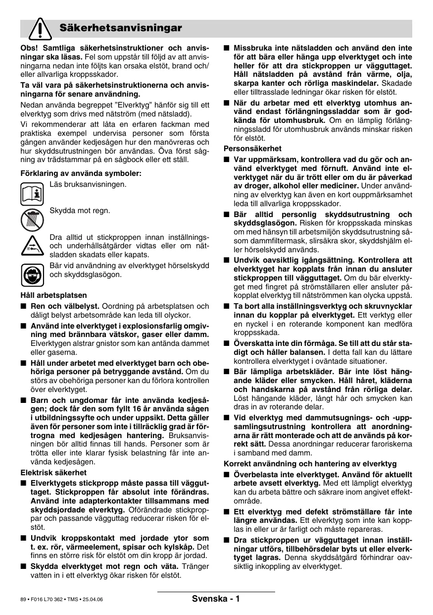 Säkerhetsanvisningar Obs! Samtliga säkerhetsinstruktioner och anvisningar ska läsas. Fel som uppstår till följd av att anvisningarna nedan inte följts kan orsaka elstöt, brand och/ eller allvarliga kroppsskador. Ta väl vara på säkerhetsinstruktionerna och anvisningarna för senare användning. Nedan använda begreppet ”Elverktyg” hänför sig till ett elverktyg som drivs med nätström (med nätsladd). Vi rekommenderar att låta en erfaren fackman med praktiska exempel undervisa personer som första gången använder kedjesågen hur den manövreras och hur skyddsutrustningen bör användas. Öva först sågning av trädstammar på en sågbock eller ett ställ. Förklaring av använda symboler: Läs bruksanvisningen. Skydda mot regn. Dra alltid ut stickproppen innan inställningsoch underhållsåtgärder vidtas eller om nätsladden skadats eller kapats. Bär vid användning av elverktyget hörselskydd och skyddsglasögon. Håll arbetsplatsen ■ Ren och välbelyst. Oordning på arbetsplatsen och dåligt belyst arbetsområde kan leda till olyckor. ■ Använd inte elverktyget i explosionsfarlig omgivning med brännbara vätskor, gaser eller damm. Elverktygen alstrar gnistor som kan antända dammet eller gaserna. ■ Håll under arbetet med elverktyget barn och obehöriga personer på betryggande avstånd. Om du störs av obehöriga personer kan du förlora kontrollen över elverktyget. ■ Barn och ungdomar får inte använda kedjesågen; dock får den som fyllt 16 år använda sågen i utbildningssyfte och under uppsikt. Detta gäller även för personer som inte i tillräcklig grad är förtrogna med kedjesågen hantering. Bruksanvisningen bör alltid finnas till hands. Personer som är trötta eller inte klarar fysisk belastning får inte använda kedjesågen. Elektrisk säkerhet ■ Elverktygets stickpropp måste passa till vägguttaget. Stickproppen får absolut inte förändras. Använd inte adapterkontakter tillsammans med skyddsjordade elverktyg. Oförändrade stickproppar och passande vägguttag reducerar risken för elstöt. ■ Undvik kroppskontakt med jordade ytor som t. ex. rör, värmeelement, spisar och kylskåp. Det finns en större risk för elstöt om din kropp är jordad. ■ Skydda elverktyget mot regn och väta. Tränger vatten in i ett elverktyg ökar risken för elstöt. 89 • F016 L70 362 • TMS • 25.04.06