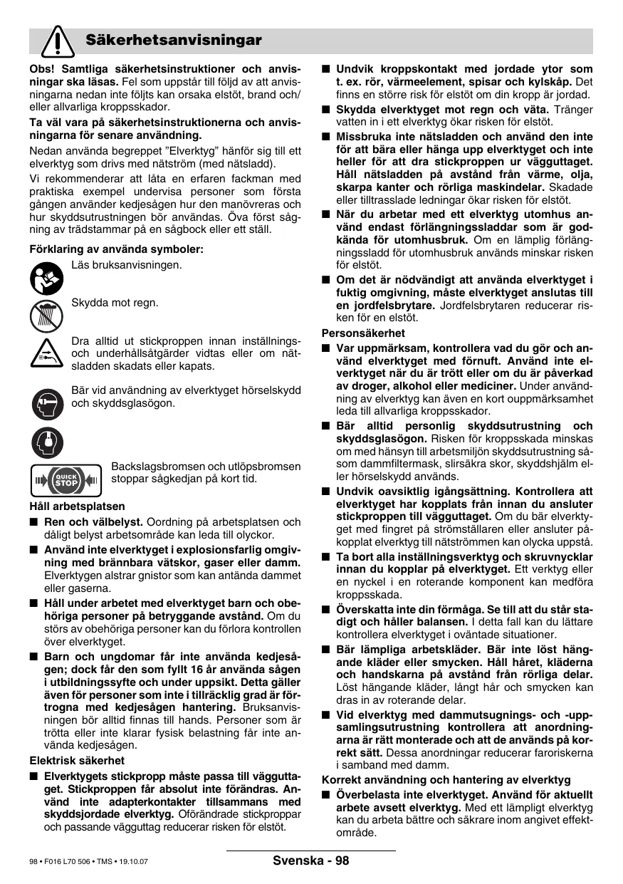 Backslagsbromsen och utlöpsbromsen stoppar sågkedjan på kort tid. Håll arbetsplatsen ■ Ren och välbelyst. Oordning på arbetsplatsen och dåligt belyst arbetsområde kan leda till olyckor. ■ Använd inte elverktyget i explosionsfarlig omgivning med brännbara vätskor, gaser eller damm. Elverktygen alstrar gnistor som kan antända dammet eller gaserna. ■ Håll under arbetet med elverktyget barn och obehöriga personer på betryggande avstånd. Om du störs av obehöriga personer kan du förlora kontrollen över elverktyget. ■ Barn och ungdomar får inte använda kedjesågen; dock får den som fyllt 16 år använda sågen i utbildningssyfte och under uppsikt. Detta gäller även för personer som inte i tillräcklig grad är förtrogna med kedjesågen hantering. Bruksanvisningen bör alltid finnas till hands. Personer som är trötta eller inte klarar fysisk belastning får inte använda kedjesågen. Elektrisk säkerhet ■ Elverktygets stickpropp måste passa till vägguttaget. Stickproppen får absolut inte förändras. Använd inte adapterkontakter tillsammans med skyddsjordade elverktyg. Oförändrade stickproppar och passande vägguttag reducerar risken för elstöt. 98 • F016 L70 506 • TMS • 19.10.07