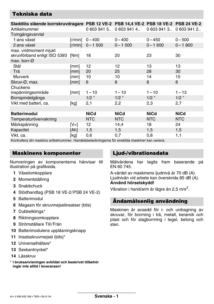 - I bruksanvisningen avbildat och beskrivet tillbehör ingår inte alltid i leveransen! 44 • 2 609 932 336 • TMS • 26.01.04 Svenska - 1