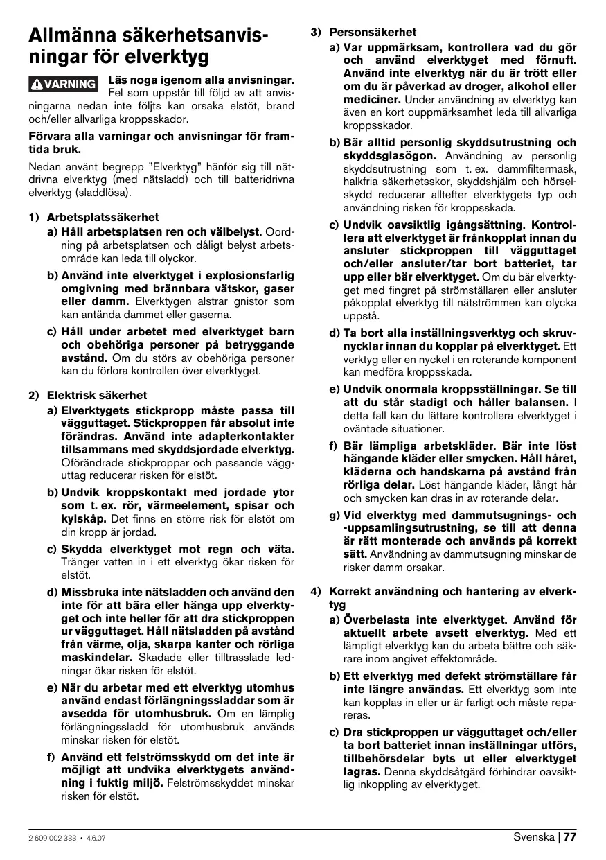 électrique. f) Si l’usage d’un outil dans un emplacement humide est inévitable, utiliser une alimentation protégée par un dispositif à courant différentiel résiduel (RCD). L’usage d’un RCD réduit le risque de choc électrique. 3) Sécurité des personnes a) Rester vigilant, regarder ce que vous êtes en train de faire et faire preuve de bon sens dans votre utilisation de l’outil. Ne pas utiliser un outil lorsque vous êtes fatigué ou sous l’emprise de drogues, d’alcool ou de médicaments. Un moment d’inattention en cours d’utilisation d’un outil peut entraîner des blessures graves des personnes. b) Utiliser un équipement de sécurité. Toujours porter une protection pour les yeux. Les équipements de sécurité tels que les masques contre les poussières, les chaussures de sécurité antidérapantes, les casques ou les protections acoustiques utilisés pour les conditions appropriées réduiront les blessures de personnes. c) Eviter tout démarrage intempestif. S’assurer que l’interrupteur est en position arrêt avant de brancher l’outil au secteur et/ou au bloc de batteries, de le ramasser ou de le porter. Porter les outils en ayant le doigt sur l’interrupteur ou brancher des outils dont l’interrupteur est en position marche est source d’accidents. d) Retirer toute clé de réglage avant de mettre l’outil en marche. Une clé laissée fixée sur une partie tournante de l’outil peut donner lieu à des blessures de personnes. e) Ne pas se précipiter. Garder une position et un équilibre adaptés à tout moment. Cela permet un meilleur contrôle de l’outil dans des situations inattendues. f) S’habiller de manière adaptée. Ne pas porter de vêtements amples ou de bijoux. Garder les cheveux, les vêtements et les gants à distance des parties en mouvement. Des vêtements amples, des bijoux ou les cheveux longs peuvent être pris dans des parties en mouvement. g) Si des dispositifs sont fournis pour le raccordement d’équipements pour l’extraction et la récupération des poussières, s’assurer qu’ils sont connectés et correctement utilisés. Utiliser des collecteurs de poussière peut réduire les risques dus aux poussières. 2 609 002 333 • 5.6.07