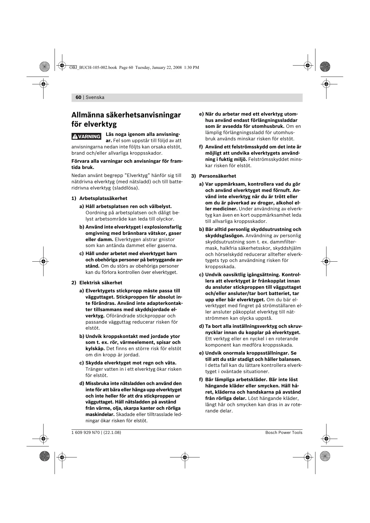 Conserver tous les avertissements et toutes les instructions pour pouvoir s’y reporter ultérieurement. Le terme « outil » dans les avertissements fait référence à votre outil électrique alimenté par le secteur (avec cordon d’alimentation) ou votre outil fonctionnant sur batterie (sans cordon d’alimentation). 1) Sécurité de la zone de travail a) Conserver la zone de travail propre et bien éclairée. Les zones en désordre ou sombres sont propices aux accidents. b) Ne pas faire fonctionner les outils électriques en atmosphère explosive, par exemple en présence de liquides inflammables, de gaz ou de poussières. Les outils électriques produisent des étincelles qui peuvent enflammer les poussières ou les fumées. c) Maintenir les enfants et les personnes présentes à l’écart pendant l’utilisation de l’outil. Les distractions peuvent vous faire perdre le contrôle de l’outil. 2) Sécurité électrique a) ll faut que les fiches de l’outil électrique soient adaptées au socle. Ne jamais modifier la fiche de quelque façon que ce soit. Ne pas utiliser d’adaptateurs avec des outils à branchement de terre. Des fiches non modifiées et des socles adaptés réduiront le risque de choc électrique. b) Eviter tout contact du corps avec des surfaces reliées à la terre telles que les tuyaux, les radiateurs, les cuisinières et les réfrigérateurs. Il existe un risque accru de choc électrique si votre corps est relié à la terre. 1 609 929 N70 | (22.1.08)
