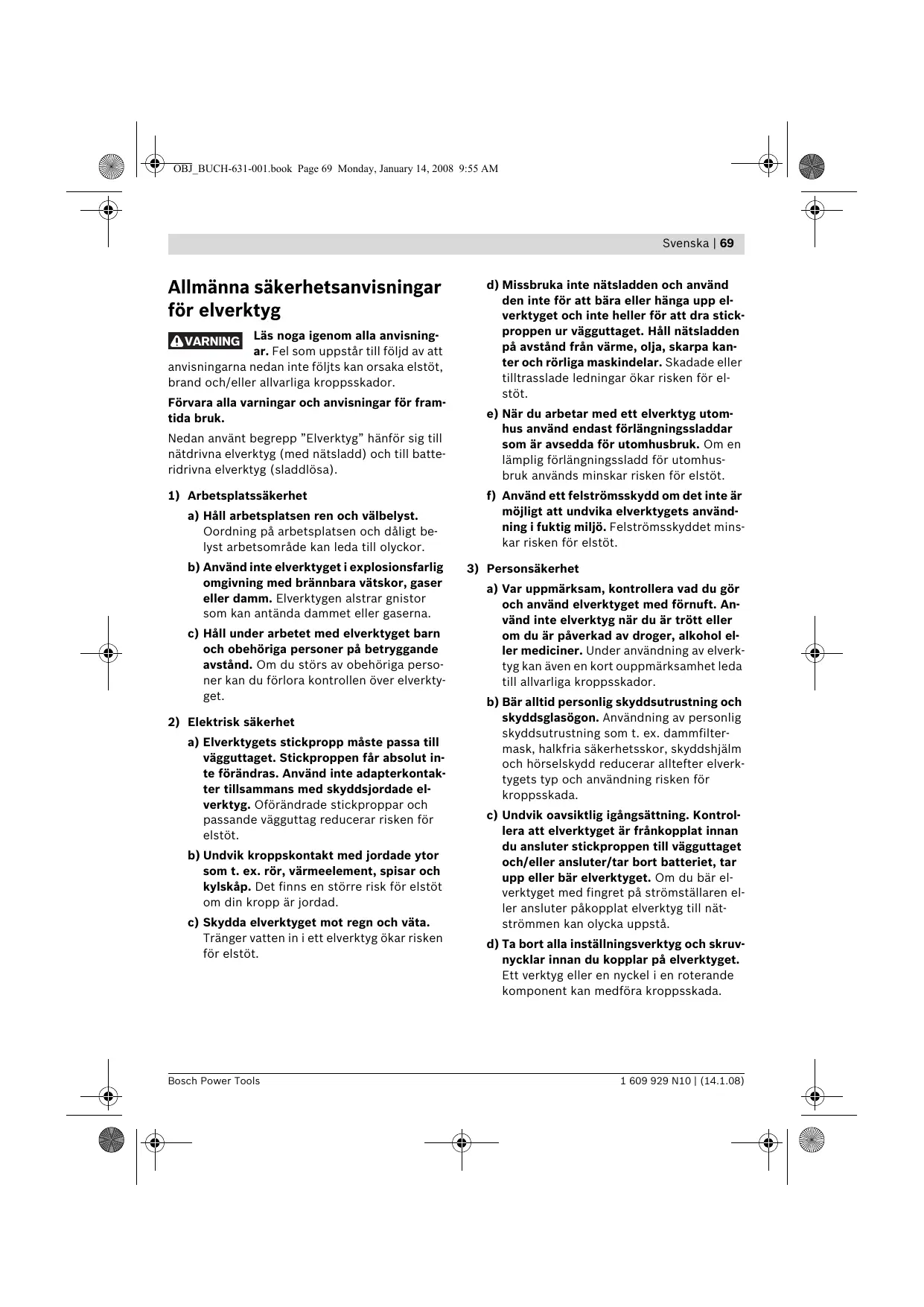 a) Var uppmärksam, kontrollera vad du gör och använd elverktyget med förnuft. Använd inte elverktyg när du är trött eller om du är påverkad av droger, alkohol eller mediciner. Under användning av elverktyg kan även en kort ouppmärksamhet leda till allvarliga kroppsskador. b) Bär alltid personlig skyddsutrustning och skyddsglasögon. Användning av personlig skyddsutrustning som t. ex. dammfiltermask, halkfria säkerhetsskor, skyddshjälm och hörselskydd reducerar alltefter elverktygets typ och användning risken för kroppsskada. c) Undvik oavsiktlig igångsättning. Kontrollera att elverktyget är frånkopplat innan du ansluter stickproppen till vägguttaget och/eller ansluter/tar bort batteriet, tar upp eller bär elverktyget. Om du bär elverktyget med fingret på strömställaren eller ansluter påkopplat elverktyg till nätströmmen kan olycka uppstå. d) Ta bort alla inställningsverktyg och skruvnycklar innan du kopplar på elverktyget. Ett verktyg eller en nyckel i en roterande komponent kan medföra kroppsskada. 1 609 929 N10 | (14.1.08) OBJ_BUCH-631-001.book Page 70 Monday, January 14, 2008 9:55 AM 70 | Svenska e) Undvik onormala kroppsställningar. Se till att du står stadigt och håller balansen. I detta fall kan du lättare kontrollera elverktyget i oväntade situationer. f) Håll skärverktygen skarpa och rena. Omsorgsfullt skötta skärverktyg med skarpa eggar kommer inte så lätt i kläm och går lättare att styra. f) Bär lämpliga arbetskläder. Bär inte löst hängande kläder eller smycken. Håll håret, kläderna och handskarna på avstånd från rörliga delar. Löst hängande kläder, långt hår och smycken kan dras in av roterande delar. g) Använd elverktyget, tillbehör, insatsverktyg osv. enligt dessa anvisningar. Ta hänsyn till arbetsvillkoren och arbetsmomenten. Om elverktyget används på ett sätt som det inte är avsett för kan farliga situationer uppstå. g) Vid elverktyg med dammutsugnings- och -uppsamlingsutrustning, se till att denna är rätt monterade och används på korrekt sätt. Användning av dammutsugning minskar de risker damm orsakar.