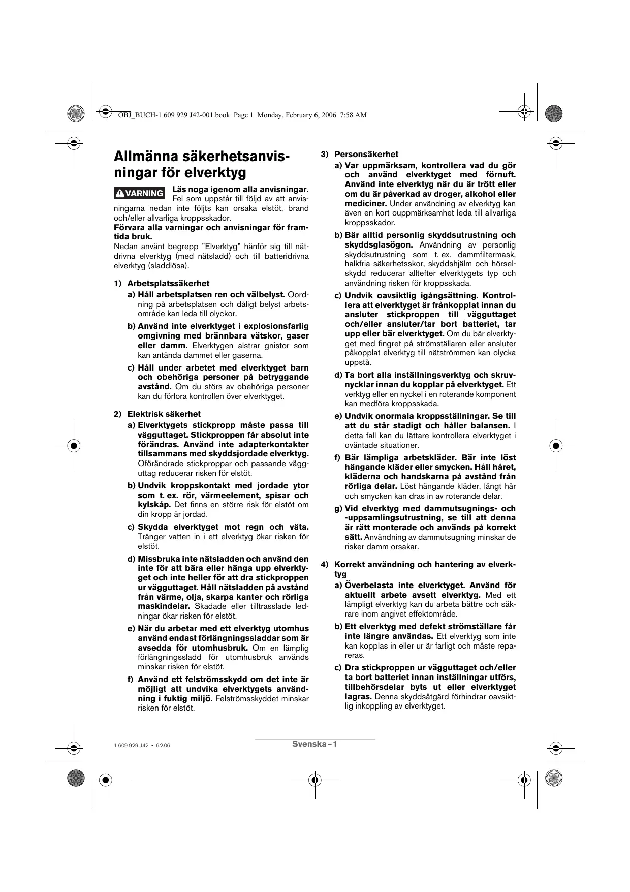 a) Var uppmärksam, kontrollera vad du gör och använd elverktyget med förnuft. Använd inte elverktyg när du är trött eller om du är påverkad av droger, alkohol eller mediciner. Under användning av elverktyg kan även en kort ouppmärksamhet leda till allvarliga kroppsskador. b) Bär alltid personlig skyddsutrustning och skyddsglasögon. Användning av personlig skyddsutrustning som t. ex. dammfiltermask, halkfria säkerhetsskor, skyddshjälm och hörselskydd reducerar alltefter elverktygets typ och användning risken för kroppsskada. c) Undvik oavsiktlig igångsättning. Kontrollera att elverktyget är frånkopplat innan du ansluter stickproppen till vägguttaget och/eller ansluter/tar bort batteriet, tar upp eller bär elverktyget. Om du bär elverktyget med fingret på strömställaren eller ansluter påkopplat elverktyg till nätströmmen kan olycka uppstå. d) Ta bort alla inställningsverktyg och skruvnycklar innan du kopplar på elverktyget. Ett verktyg eller en nyckel i en roterande komponent kan medföra kroppsskada. e) Undvik onormala kroppsställningar. Se till att du står stadigt och håller balansen. I detta fall kan du lättare kontrollera elverktyget i oväntade situationer. f) Bär lämpliga arbetskläder. Bär inte löst hängande kläder eller smycken. Håll håret, kläderna och handskarna på avstånd från rörliga delar. Löst hängande kläder, långt hår och smycken kan dras in av roterande delar. c) Skydda elverktyget mot regn och väta. Tränger vatten in i ett elverktyg ökar risken för elstöt. g) Vid elverktyg med dammutsugnings- och -uppsamlingsutrustning, se till att denna är rätt monterade och används på korrekt sätt. Användning av dammutsugning minskar de risker damm orsakar. d) Missbruka inte nätsladden och använd den inte för att bära eller hänga upp elverktyget och inte heller för att dra stickproppen ur vägguttaget. Håll nätsladden på avstånd från värme, olja, skarpa kanter och rörliga maskindelar. Skadade eller tilltrasslade ledningar ökar risken för elstöt.