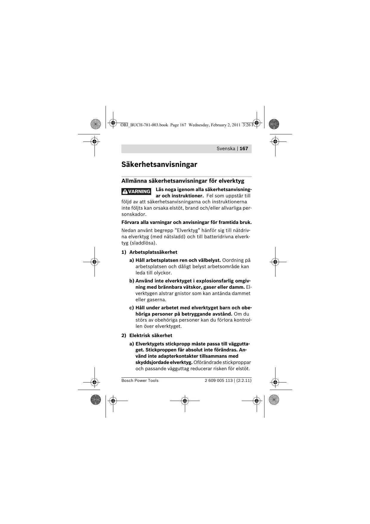 a) Överbelasta inte elverktyget. Använd för aktuellt arbete avsett elverktyg. Med ett lämpligt elverktyg kan du arbeta bättre och säkrare inom angivet effektområde. b) Ett elverktyg med defekt strömställare får inte längre användas. Ett elverktyg som inte kan kopplas in eller ur är farligt och måste repareras. c) Dra stickproppen ur vägguttaget och/eller ta bort batteriet innan inställningar utförs, tillbehörsdelar byts ut eller elverktyget lagras. Denna skyddsåtgärd förhindrar oavsiktlig inkoppling av elverktyget. d) Förvara elverktygen oåtkomliga för barn. Låt elverktyget inte användas av personer som inte är förtrogna med dess användning eller inte läst denna anvisning. Elverktygen är farliga om de används av oerfarna personer. e) Sköt elverktyget omsorgsfullt. Kontrollera att rörliga komponenter fungerar felfritt och inte kärvar, att komponenter inte brustit eller skadats; orsaker som kan leda till att elverktygets funktioner påverkas menligt. Låt skadade delar repareras innan elverktyget tas i bruk. Många olyckor orsakas av dåligt skötta elverktyg. f) Håll skärverktygen skarpa och rena. Omsorgsfullt skötta skärverktyg med skarpa eggar kommer inte så lätt i kläm och går lättare att styra. 2 609 005 113 | (2.2.11) Bosch Power Tools OBJ_BUCH-781-003.book Page 171 Wednesday, February 2, 2011 3:26 PM Svenska | 171 g) Använd elverktyget, tillbehör, insatsverktyg osv. enligt dessa anvisningar. Ta hänsyn till arbetsvillkoren och arbetsmomenten. Om elverktyget används på ett sätt som det inte är avsett för kan farliga situationer uppstå.