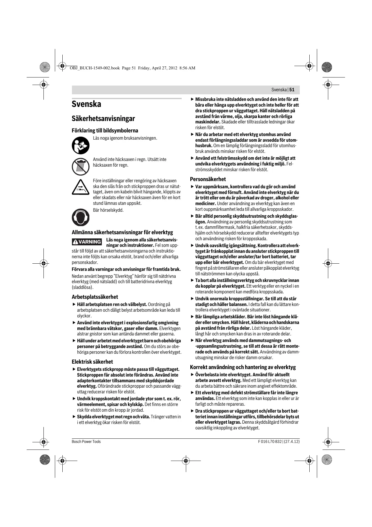 Mätningen av den vibrationsnivå som anges i denna anvisning har utförts enligt en mätmetod som är standardiserad i EN 60745 och kan användas vid jämförelse av olika elverktyg. Mätmetoden är även lämplig för preliminär bedömning av vibrationsbelastningen. Den angivna vibrationsnivån representerar den huvudsakliga användningen av elverktyget. Om däremot elverktyget används för andra ändamål och med andra insatsverktyg eller inte underhållits ordentligt kan vibrationsnivån avvika. Härvid kan vibrationsbelastningen under arbetsperioden öka betydligt. F 016 L70 832 | (27.4.12)