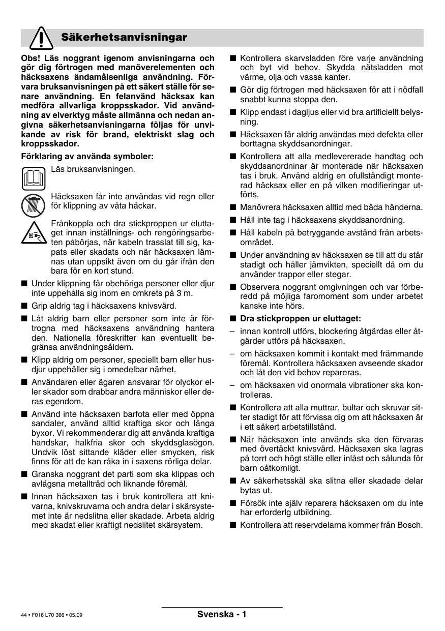 (AHS 6000/7000 PRO-T). Procedurer for overensstemmelsesvurdering iht. bilag V. Leinfelden, 01.10.2005. Dr. Egbert Schneider Senior Vice President Engineering Dr. Eckerhard Strötgen Head of Product Certification Robert Bosch GmbH, Power Tools Division Ret til ændringer forbeholdes 43 • F016 L70 366 • 05.09 Dansk - 5 Säkerhetsanvisningar Obs! Läs noggrant igenom anvisningarna och gör dig förtrogen med manöverelementen och häcksaxens ändamålsenliga användning. Förvara bruksanvisningen på ett säkert ställe för senare användning. En felanvänd häcksax kan medföra allvarliga kroppsskador. Vid användning av elverktyg måste allmänna och nedan angivna säkerhetsanvisningarna följas för unvikande av risk för brand, elektriskt slag och kroppsskador. Förklaring av använda symboler: Läs bruksanvisningen. Häcksaxen får inte användas vid regn eller för klippning av våta häckar.