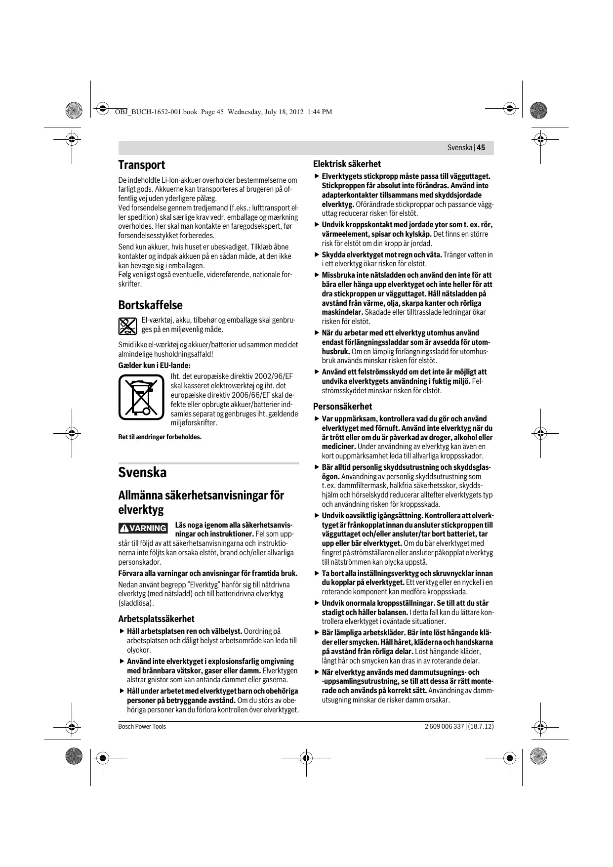 Bosch kundeservice-team vil gerne hjælpe dig med at besvare spørgsmål vedr. køb, anvendelse og indstilling af produkter og tilbehør. El-værktøjets 10-cifrede typenummer (se typeskilt) skal altid angives ved forespørgsler og bestilling af reservedele. Dansk Bosch Service Center Telegrafvej 3 2750 Ballerup Tlf. Service Center: +45 (4489) 8855 Fax: +45 (4489) 87 55 E-Mail: vaerktoej@dk.bosch.com Bosch Power Tools OBJ_BUCH-1652-001.book Page 45 Wednesday, July 18, 2012 1:44 PM Svenska | 45 Transport De indeholdte Li-Ion-akkuer overholder bestemmelserne om farligt gods. Akkuerne kan transporteres af brugeren på offentlig vej uden yderligere pålæg. Ved forsendelse gennem tredjemand (f.eks.: lufttransport eller spedition) skal særlige krav vedr. emballage og mærkning overholdes. Her skal man kontakte en faregodsekspert, før forsendelsesstykket forberedes. Send kun akkuer, hvis huset er ubeskadiget. Tilklæb åbne kontakter og indpak akkuen på en sådan måde, at den ikke kan bevæge sig i emballagen. Følg venligst også eventuelle, videreførende, nationale forskrifter. Bortskaffelse El-værktøj, akku, tilbehør og emballage skal genbruges på en miljøvenlig måde. Smid ikke el-værktøj og akkuer/batterier ud sammen med det almindelige husholdningsaffald! Gælder kun i EU-lande: Iht. det europæiske direktiv 2002/96/EF skal kasseret elektroværktøj og iht. det europæiske direktiv 2006/66/EF skal defekte eller opbrugte akkuer/batterier indsamles separat og genbruges iht. gældende miljøforskrifter. Ret til ændringer forbeholdes. Svenska Allmänna säkerhetsanvisningar för elverktyg Läs noga igenom alla säkerhetsanvisningar och instruktioner. Fel som uppstår till följd av att säkerhetsanvisningarna och instruktionerna inte följts kan orsaka elstöt, brand och/eller allvarliga personskador. Förvara alla varningar och anvisningar för framtida bruk. Nedan använt begrepp ”Elverktyg” hänför sig till nätdrivna elverktyg (med nätsladd) och till batteridrivna elverktyg (sladdlösa). VARNING Arbetsplatssäkerhet f Håll arbetsplatsen ren och välbelyst. Oordning på arbetsplatsen och dåligt belyst arbetsområde kan leda till olyckor. f Använd inte elverktyget i explosionsfarlig omgivning med brännbara vätskor, gaser eller damm. Elverktygen alstrar gnistor som kan antända dammet eller gaserna. f Håll under arbetet med elverktyget barn och obehöriga personer på betryggande avstånd. Om du störs av obehöriga personer kan du förlora kontrollen över elverktyget. Bosch Power Tools Elektrisk säkerhet f Elverktygets stickpropp måste passa till vägguttaget. Stickproppen får absolut inte förändras. Använd inte adapterkontakter tillsammans med skyddsjordade elverktyg. Oförändrade stickproppar och passande vägguttag reducerar risken för elstöt. f Undvik kroppskontakt med jordade ytor som t. ex. rör, värmeelement, spisar och kylskåp. Det finns en större risk för elstöt om din kropp är jordad. f Skydda elverktyget mot regn och väta. Tränger vatten in i ett elverktyg ökar risken för elstöt. f Missbruka inte nätsladden och använd den inte för att bära eller hänga upp elverktyget och inte heller för att dra stickproppen ur vägguttaget. Håll nätsladden på avstånd från värme, olja, skarpa kanter och rörliga maskindelar. Skadade eller tilltrasslade ledningar ökar risken för elstöt. f När du arbetar med ett elverktyg utomhus använd endast förlängningssladdar som är avsedda för utomhusbruk. Om en lämplig förlängningssladd för utomhusbruk används minskar risken för elstöt. f Använd ett felströmsskydd om det inte är möjligt att undvika elverktygets användning i fuktig miljö. Felströmsskyddet minskar risken för elstöt. Personsäkerhet f Var uppmärksam, kontrollera vad du gör och använd elverktyget med förnuft. Använd inte elverktyg när du är trött eller om du är påverkad av droger, alkohol eller mediciner. Under användning av elverktyg kan även en kort ouppmärksamhet leda till allvarliga kroppsskador. f Bär alltid personlig skyddsutrustning och skyddsglasögon. Användning av personlig skyddsutrustning som t.ex. dammfiltermask, halkfria säkerhetsskor, skyddshjälm och hörselskydd reducerar alltefter elverktygets typ och användning risken för kroppsskada. f Undvik oavsiktlig igångsättning. Kontrollera att elverktyget är frånkopplat innan du ansluter stickproppen till vägguttaget och/eller ansluter/tar bort batteriet, tar upp eller bär elverktyget. Om du bär elverktyget med fingret på strömställaren eller ansluter påkopplat elverktyg till nätströmmen kan olycka uppstå. f Ta bort alla inställningsverktyg och skruvnycklar innan du kopplar på elverktyget. Ett verktyg eller en nyckel i en roterande komponent kan medföra kroppsskada. f Undvik onormala kroppsställningar. Se till att du står stadigt och håller balansen. I detta fall kan du lättare kontrollera elverktyget i oväntade situationer. f Bär lämpliga arbetskläder. Bär inte löst hängande kläder eller smycken. Håll håret, kläderna och handskarna på avstånd från rörliga delar. Löst hängande kläder, långt hår och smycken kan dras in av roterande delar. f När elverktyg används med dammutsugnings- och -uppsamlingsutrustning, se till att dessa är rätt monterade och används på korrekt sätt. Användning av dammutsugning minskar de risker damm orsakar. 2 609 006 337 | (18.7.12) OBJ_BUCH-1652-001.book Page 46 Wednesday, July 18, 2012 1:44 PM 46 | Svenska Korrekt användning och hantering av elverktyg f Överbelasta inte elverktyget. Använd för aktuellt arbete avsett elverktyg. Med ett lämpligt elverktyg kan du arbeta bättre och säkrare inom angivet effektområde. f Ett elverktyg med defekt strömställare får inte längre användas. Ett elverktyg som inte kan kopplas in eller ur är farligt och måste repareras. f Dra stickproppen ur vägguttaget och/eller ta bort batteriet innan inställningar utförs, ti