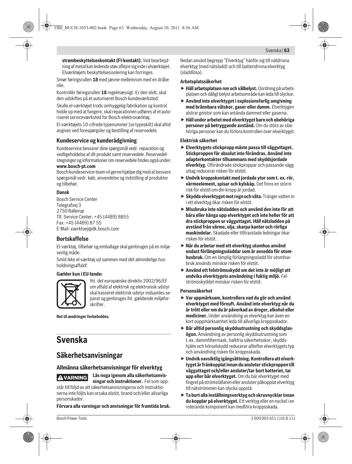 Vous êtes un utilisateur, contactez : Le Service Clientèle Bosch Outillage Electroportatif Tel. : 0 811 36 01 22 (coût d’une communication locale) Fax : +33 (0) 1 49 45 47 67 Seulement pour les pays de l’Union Européenne : Conformément à la directive européenne 2002/96/CE relative aux déchets d’équipements électriques et électroniques et sa mise en vigueur conformément aux législations nationales, les outils électroportatifs dont on ne peut plus se servir doivent être isolés et suivre une voie de recyclage appropriée. Sous réserve de modifications.