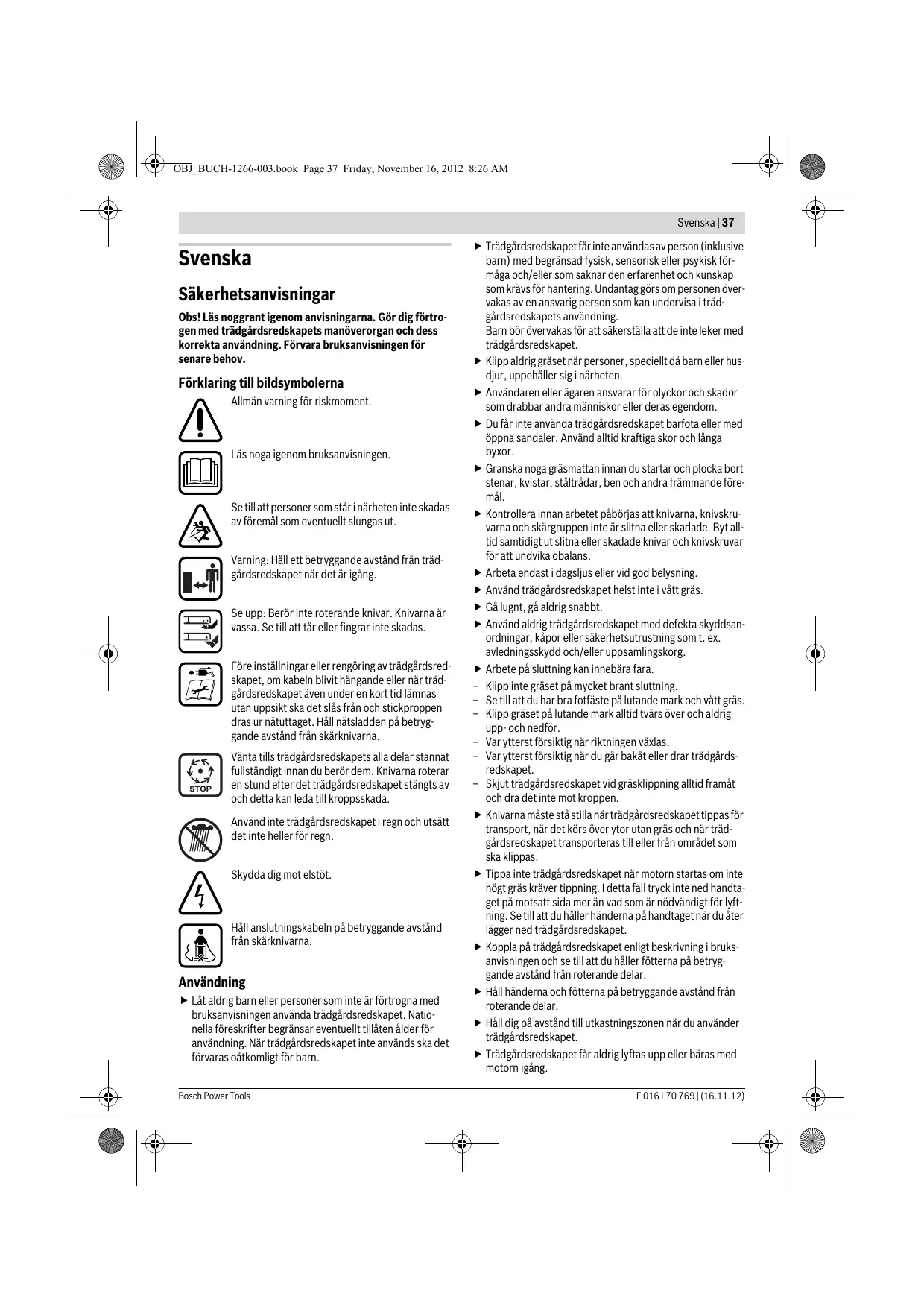 F 016 L70 769 | (16.11.12) OBJ_BUCH-1266-003.book Page 36 Friday, November 16, 2012 8:26 AM 36 | Dansk Fejlsøgning STOP Symptom Motor går ikke i gang Mulig årsag Strøm er afbrudt Stikkontakt er defekt Forlængerledning er beskadiget Defekt/sprunget sikring Tilstopning mulig Motorværn er aktiveret Slåhøjde for lav til øjeblikkelige betingelser Haveværktøj kører i intervaller Forlængerledning er beskadiget Haveværktøjets indvendige ledninger er beskadiget Motorværn er aktiveret Haveværktøj klipper ikke jævnt Slåhøjden er for lav og/eller Knive er sløve Motoren arbejder tungt Tilstopning mulig Når haveværktøjet tændes, drejer kniven ikke For stor vibration/støj Kniven er monteret forkert Kniven bremses af græsset Knivmøtrikken/-skruen er løs Knivmøtrikken/-skruen er løs Knivene er beskadigede Afhjælpning Kontroller og tænd for strømmen Prøv en anden stikkontakt Ledning kontrolleres og skiftes, hvis den er beskadiget Udskift sikring Kontrollér haveværktøjet og frigør det evt. for græs (brug altid havehandsker) Lad motoren afkøle og indstil en større slåhøjde Indstil en større slåhøjde Ledning kontrolleres og skiftes, hvis den er beskadiget Kontakt serviceforhandleren Lad motoren afkøle og indstil en større slåhøjde Indstil en større slåhøjde Kniv skiftes Kontrollér haveværktøjet og frigør det evt. for græs (brug altid havehandsker) Montér kniven rigtigt Sluk for haveværktøjet Fjern tilstopning (brug altid havehandsker) Spænd knivmøtrikken/-skruen (17 Nm) Spænd knivmøtrikken/-skruen (17 Nm) Kniv skiftes Kundeservice og brugerrådgivning Bortskaffelse www.bosch-garden.com Det 10-cifrede typenummer på haveværktøjets typeskilt skal altid angives ved forespørgsler og bestilling af reservedele. Smid ikke haveværktøjet ud sammen med det almindelige husholdningsaffald! Gælder kun i EU-lande: Iht. det europæiske direktiv 2002/96/EF om affald af elektrisk og elektronisk udstyr (WEEE) og omsætning af dette til national ret skal kasseret elektrisk og elektronisk udstyr indsamles separat og genbruges iht. gældende miljøforskrifter. Dansk Bosch Service Center Telegrafvej 3 2750 Ballerup Tlf. Service Center: 44898855 Fax: 44898755 E-Mail: vaerktoej@dk.bosch.com F 016 L70 769 | (16.11.12) Ret til ændringer forbeholdes. Bosch Power Tools OBJ_BUCH-1266-003.book Page 37 Friday, November 16, 2012 8:26 AM Svenska | 37 Svenska Säkerhetsanvisningar Obs! Läs noggrant igenom anvisningarna. Gör dig förtrogen med trädgårdsredskapets manöverorgan och dess korrekta användning. Förvara bruksanvisningen för senare behov. Förklaring till bildsymbolerna Allmän varning för riskmoment. Läs noga igenom bruksanvisningen. Se till att personer som står i närheten inte skadas av föremål som eventuellt slungas ut. Varning: Håll ett betryggande avstånd från trädgårdsredskapet när det är igång. Se upp: Berör inte roterande knivar. Knivarna är vassa. Se till att tår eller fingrar inte skadas. Före inställningar eller rengöring av trädgårdsredskapet, om kabeln blivit hängande eller när trädgårdsredskapet även under en kort tid lämnas utan uppsikt ska det slås från och stickproppen dras ur nätuttaget. Håll nätsladden på betryggande avstånd från skärknivarna. Vänta tills trädgårdsredskapets alla delar stannat fullständigt innan du berör dem. Knivarna roterar en stund efter det trädgårdsredskapet stängts av och detta kan leda till kroppsskada. Använd inte trädgårdsredskapet i regn och utsätt det inte heller för regn. Skydda dig mot elstöt. Håll anslutningskabeln på betryggande avstånd från skärknivarna. Användning Låt aldrig barn eller personer som inte är förtrogna med bruksanvisningen använda trädgårdsredskapet. Nationella föreskrifter begränsar eventuellt tillåten ålder för användning. När trädgårdsredskapet inte används ska det förvaras oåtkomligt för barn. Bosch Power Tools Trädgårdsredskapet får inte användas av person (inklusive barn) med begränsad fysisk, sensorisk eller psykisk förmåga och/eller som saknar den erfarenhet och kunskap som krävs för hantering. Undantag görs om personen övervakas av en ansvarig person som kan undervisa i trädgårdsredskapets användning. Barn bör övervakas för att säkerställa att de inte leker med trädgårdsredskapet. Klipp aldrig gräset när personer, speciellt då barn eller husdjur, uppehåller sig i närheten. Användaren eller ägaren ansvarar för olyckor och skador som drabbar andra människor eller deras egendom. Du får inte använda trädgårdsredskapet barfota eller med öppna sandaler. Använd alltid kraftiga skor och långa byxor. Granska noga gräsmattan innan du startar och plocka bort stenar, kvistar, ståltrådar, ben och andra främmande föremål. Kontrollera innan arbetet påbörjas att knivarna, knivskruvarna och skärgruppen inte är slitna eller skadade. Byt alltid samtidigt ut slitna eller skadade knivar och knivskruvar för att undvika obalans. Arbeta endast i dagsljus eller vid god belysning. Använd trädgårdsredskapet helst inte i vått gräs. Gå lugnt, gå aldrig snabbt. Använd aldrig trädgårdsredskapet med defekta skyddsanordningar, kåpor eller säkerhetsutrustning som t. ex. avledningsskydd och/eller uppsamlingskorg. Arbete på sluttning kan innebära fara. – Klipp inte gräset på mycket brant sluttning. – Se till att du har bra fotfäste på lutande mark och vått gräs. – Klipp gräset på lutande mark alltid tvärs över och aldrig upp- och nedför. – Var ytterst försiktig när riktningen växlas. – Var ytterst försiktig när du går bakåt eller drar trädgårdsredskapet. – Skjut trädgårdsredskapet vid gräsklippning alltid framåt och dra det inte mot kroppen. Knivarna måste stå stilla när trädgårdsredskapet tippas för transport, när det körs över ytor utan gräs och när trädgårdsredskapet transporteras till eller från området som ska klippas. Tip