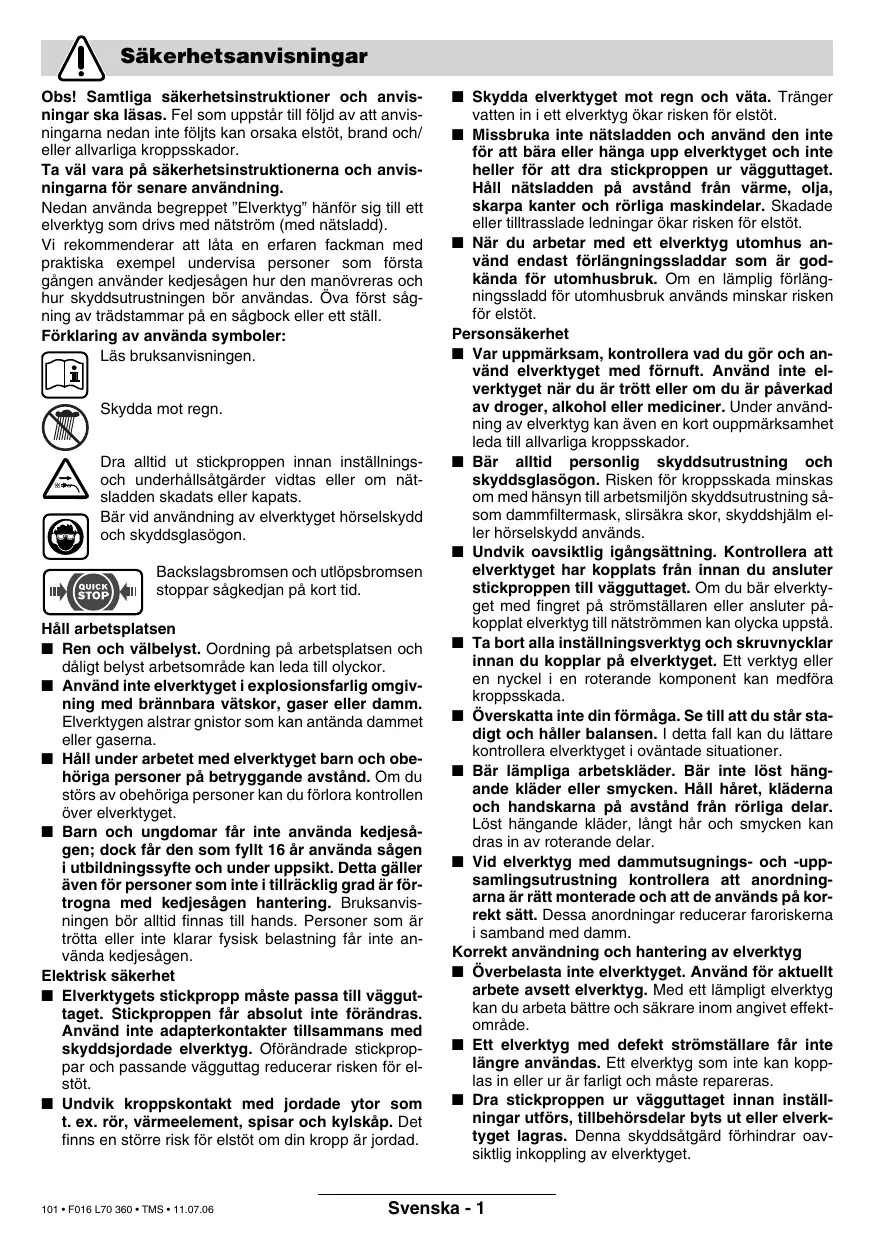 Prova di omologazione num. 2088141.01 CE attraverso stazione di collaudo notificata num. 0344. CE 2000/14: Il livello della potenza sonora L WA garantito è minore di 104 dB (A). Procedimento di valutazione della conformità secondo appendice V. Leinfelden, 01.09.2005. Dr. Egbert Schneider Als u de machine wilt uitschakelen, laat u de aan/ uit-schakelaar 2 los. Na het zagen mag de kettingzaag niet worden gestopt door het bedienen van de voorste handbescherming (activeren van de terugslagrem).