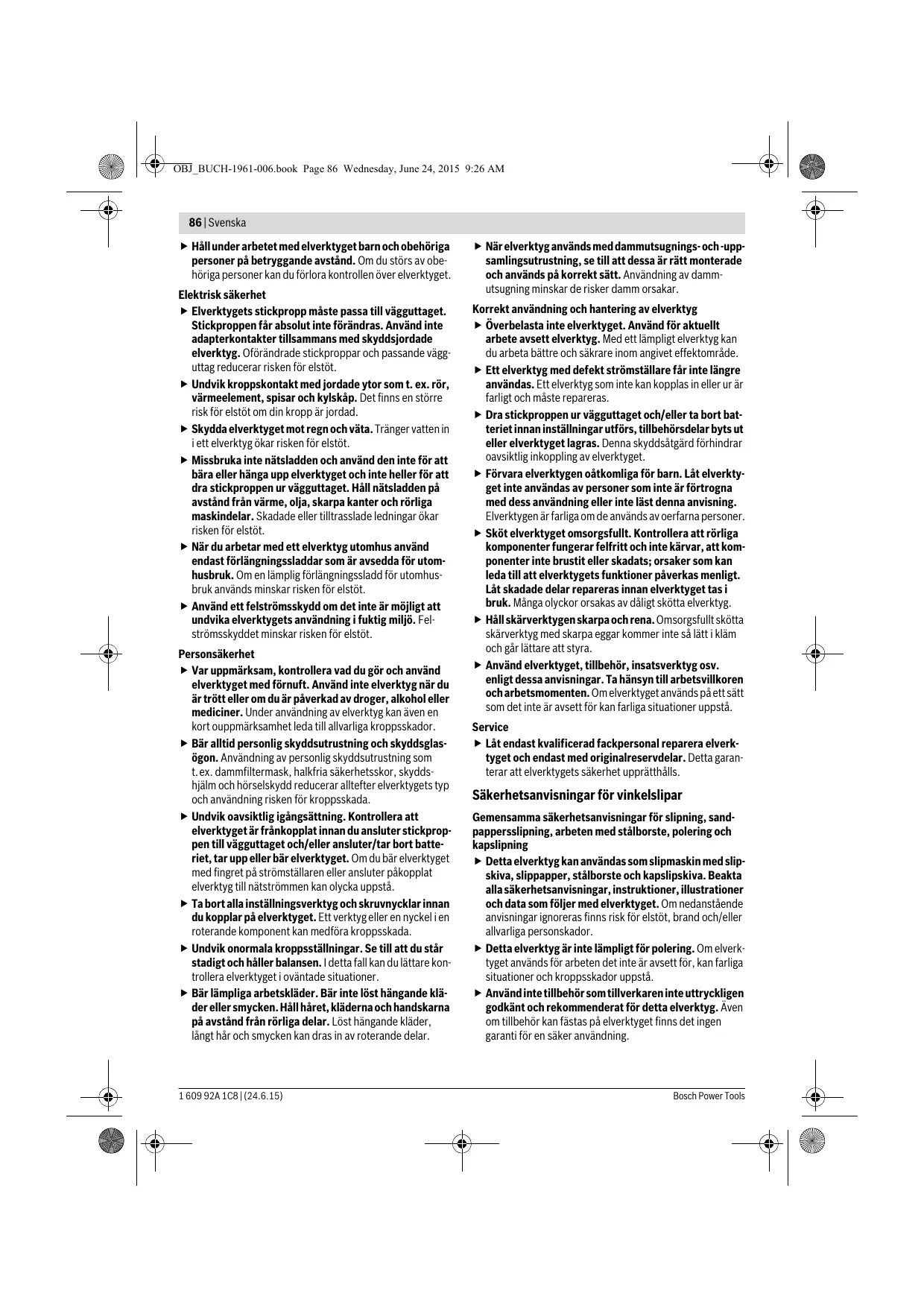 Skæring i metal Brug altid beskyttelseskappen, når der skal skæres i bundede slibemidler 12. Gennemskæring skal gennemføres med jævn fremføring, der passer til det materiale, der skal bearbejdes. Udsæt ikke skæreskiven for tryk, sørg for, at den hverken kommer i klemme eller oscillerer. Forsøg ikke at bremse udløbende skæreskiver ved at trykke mod dem i siden. El-værktøjet skal altid føres i modløbet. Ellers er der fare for, at det trykkes ukontrolleret ud af snittet. Profiler og firkantede rør skal helst skæres over på det sted, hvor tværsnittet er mindst. Skæring i sten Sørg for tilstrækkelig støvopsugning, når der skæres i sten. Brug beskyttelsesmaske. El-værktøjet må kun benyttes til tørskæring/tørslibning. Bosch Power Tools OBJ_BUCH-1961-006.book Page 85 Wednesday, June 24, 2015 9:26 AM Svenska | 85 Der bør altid anvendes en diamant-skæreskive til skæring i sten. Bruges opsugningskappen til skæring med føringsslæde 19 skal støvsugeren være godkendt til at opsuge stenstøv. Bosch tilbyder egnede støvsugere. Tænd for el-værktøjet og anbring den forreste del af føringsslæden på emnet. Skub el-værktøjet frem med jævn fremføring, der passer til det materiale, der skal bearbejdes. Når der skæres i meget hårde materialer som f.eks. beton med et stort kieseindhold, kan diamantskæreskiven blive for varm og derved beskadiges. En gnistkrans, der løber med diamantskæreskiven, er et tydeligt tegn herpå. Afbryd i dette tilfælde skærearbejdet og lad diamant-skæreskiven afkøle i tomgang ved max. omdrejningstal i kort tid, så den kan afkøle. Et mærkbart langsommere arbejdsskridt og en gnistkrans er tegn på, at diamant-skæreskiven er uskarp. Denne slibes igen ved at køre den i porøst materiale (f.eks. kalksten) i korte bevægelser. Statiske forskrifter Slidser i bærende vægge skal overholde bestemmelserne i standarden DIN 1053 del 1 eller specielle krav, som gælder i det enkelte land. Disse forskrifter skal ubetinget overholdes. Spørg den ansvarlige statiker, arkitekt eller byggeledelse til råds, før arbejdet påbegyndes. Vedligeholdelse og service Vedligeholdelse og rengøring Træk stikket ud af stikkontakten, før der udføres arbejde på el-værktøjet. El-værktøj og el-værktøjets ventilationsåbninger skal altid holdes rene for at sikre et godt og sikkert arbejde. Brug så vidt muligt altid et opsugningsanlæg ved ekstreme brugsbetingelser. Blæs ventilationsåbningerne igennem med hyppige mellemrum og forkoble en fejlstrømbeskyttelseskontakt (PRCD). Ved bearbejdning af metal kan ledende støv aflejre sig inde i elværktøjet. Elværktøjets beskyttelsesisolering kan forringes. Opbevar og behandle tilbehøret omhyggeligt. Hvis det er nødvendigt at erstatte tilslutningsledningen, skal dette arbejde udføres af Bosch eller på et autoriseret serviceværksted for Bosch el-værktøj for at undgå farer. Bosch Power Tools Kundeservice og brugerrådgivning Kundeservice besvarer dine spørgsmål vedr. reparation og vedligeholdelse af dit produkt samt reservedele. Eksplosionstegninger og informationer om reservedele findes også under: www.bosch-pt.com Bosch brugerrådgivningsteamet vil gerne hjælpe dig med at besvare spørgsmål vedr. vores produkter og deres tilbehør. Produktets 10-cifrede typenummer (se typeskilt) skal altid angives ved forespørgsler og bestilling af reservedele. Dansk Bosch Service Center Telegrafvej 3 2750 Ballerup På www.bosch-pt.dk kan der online bestilles reservedele eller oprettes en reparations ordre. Tlf. Service Center: 44898855 Fax: 44898755 E-Mail: vaerktoej@dk.bosch.com Bortskaffelse El-værktøj, tilbehør og emballage skal genbruges på en miljøvenlig måde. Smid ikke el-værktøj ud sammen med det almindelige husholdningsaffald! Gælder kun i EU-lande: Iht. det europæiske direktiv 2012/19/EU om affald af elektrisk og elektronisk udstyr skal kasseret elektrisk udstyr indsamles separat og genbruges iht. gældende miljøforskrifter. Ret til ændringer forbeholdes. Svenska Säkerhetsanvisningar Allmänna säkerhetsanvisningar för elverktyg VARNING Läs noga igenom alla säkerhetsanvisningar och instruktioner. Fel som uppstår till följd av att säkerhetsanvisningarna och instruktionerna inte följts kan orsaka elstöt, brand och/eller allvarliga personskador. Förvara alla varningar och anvisningar för framtida bruk. Nedan använt begrepp ”Elverktyg” hänför sig till nätdrivna elverktyg (med nätsladd) och till batteridrivna elverktyg (sladdlösa). Arbetsplatssäkerhet Håll arbetsplatsen ren och välbelyst. Oordning på arbetsplatsen och dåligt belyst arbetsområde kan leda till olyckor. Använd inte elverktyget i explosionsfarlig omgivning med brännbara vätskor, gaser eller damm. Elverktygen alstrar gnistor som kan antända dammet eller gaserna. 1 609 92A 1C8 | (24.6.15) OBJ_BUCH-1961-006.book Page 86 Wednesday, June 24, 2015 9:26 AM 86 | Svenska Håll under arbetet med elverktyget barn och obehöriga personer på betryggande avstånd. Om du störs av obehöriga personer kan du förlora kontrollen över elverktyget. Elektrisk säkerhet Elverktygets stickpropp måste passa till vägguttaget. Stickproppen får absolut inte förändras. Använd inte adapterkontakter tillsammans med skyddsjordade elverktyg. Oförändrade stickproppar och passande vägguttag reducerar risken för elstöt. Undvik kroppskontakt med jordade ytor som t. ex. rör, värmeelement, spisar och kylskåp. Det finns en större risk för elstöt om din kropp är jordad. Skydda elverktyget mot regn och väta. Tränger vatten in i ett elverktyg ökar risken för elstöt. Missbruka inte nätsladden och använd den inte för att bära eller hänga upp elverktyget och inte heller för att dra stickproppen ur vägguttaget. Håll nätsladden på avstånd från värme, olja, skarpa kanter och rörliga maskindelar. Skadade eller tilltrasslade ledningar ökar risken för elstöt. När du arbetar med ett elverktyg uto