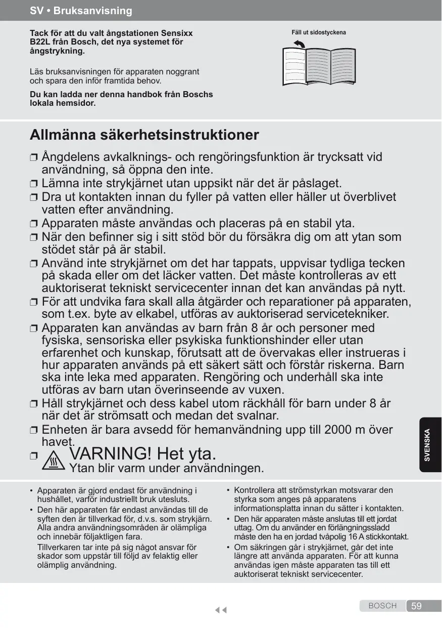 BOSCH SV • Bruksanvisning Tack för att du valt ångstationen Sensixx B22L från Bosch, det nya systemet för ångstrykning. Fäll ut sidostyckena Läs bruksanvisningen för apparaten noggrant och spara den inför framtida behov. Du kan ladda ner denna handbok från Boschs lokala hemsidor. Allmänna säkerhetsinstruktioner ❐❐ Ångdelens avkalknings- och rengöringsfunktion är trycksatt vid användning, så öppna den inte. ❐❐ Lämna inte strykjärnet utan uppsikt när det är påslaget. ❐❐ Dra ut kontakten innan du fyller på vatten eller häller ut överblivet vatten efter användning. ❐❐ Apparaten måste användas och placeras på en stabil yta. ❐❐ När den befinner sig i sitt stöd bör du försäkra dig om att ytan som stödet står på är stabil. på skada eller om det läcker vatten. Det måste kontrolleras av ett auktoriserat tekniskt servicecenter innan det kan användas på nytt. ❐❐ För att undvika fara skall alla åtgärder och reparationer på apparaten, som t.ex. byte av elkabel, utföras av auktoriserad servicetekniker. ❐❐ Apparaten kan användas av barn från 8 år och personer med fysiska, sensoriska eller psykiska funktionshinder eller utan erfarenhet och kunskap, förutsatt att de övervakas eller instrueras i hur apparaten används på ett säkert sätt och förstår riskerna. Barn ska inte leka med apparaten. Rengöring och underhåll ska inte utföras av barn utan överinseende av vuxen. ❐❐ Håll strykjärnet och dess kabel utom räckhåll för barn under 8 år när det är strömsatt och medan det svalnar. ❐❐ Enheten är bara avsedd för hemanvändning upp till 2000 m över havet.