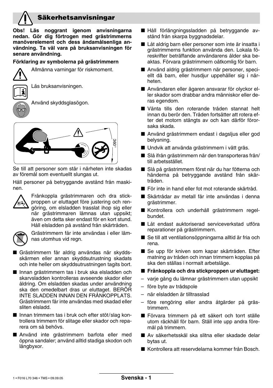 Dr. Eckerhard Strötgen Head of Product Certification Dansk - 6 Säkerhetsanvisningar Obs! Läs noggrant igenom anvisningarna nedan. Gör dig förtrogen med grästrimmerns manöverelement och dess ändamålsenliga användning. Ta väl vara på bruksanvisningen för senare användning. Förklaring av symbolerna på grästrimmern Allmänna varningar för riskmoment. Läs bruksanvisningen. Använd skyddsglasögon. 360° Se till att personer som står i närheten inte skadas av föremål som eventuellt slungas ut. Håll personer på betryggande avstånd från maskinen. Frånkoppla grästrimmaren och dra stickproppen ur eluttaget före justering och rengöring, om elsladden trasslat ihop sig eller när grästrimmaren lämnas utan uppsikt; även om detta sker endast för en kort stund. Håll elsladden på avstånd från skärtråden. Grästrimmern får inte användas i eller lämnas utomhus vid regn. ■ Grästrimmern får aldrig användas när skyddsskärmen eller annan skyddsutrustning skadats och inte heller om skyddsutrustningen tagits bort. ■ Innan grästrimmern tas i bruk ska elsladden och skarvsladden kontrolleras avseende skador eller åldring. Om elsladden skadas under användning ska den omedelbart dras ur eluttaget. BERÖR INTE SLADDEN INNAN DEN FRÅNKOPPLATS. Grästrimmern får inte användas med skadad eller sliten elsladd. ■ Innan trimmern tas i bruk och efter stöt/slag kontrollera trimmern för slitage eller skador och reparera om så behövs. ■ Använd inte grästrimmern barfota eller med öppna sandaler; använd alltid stadiga skodon och långbyxor.