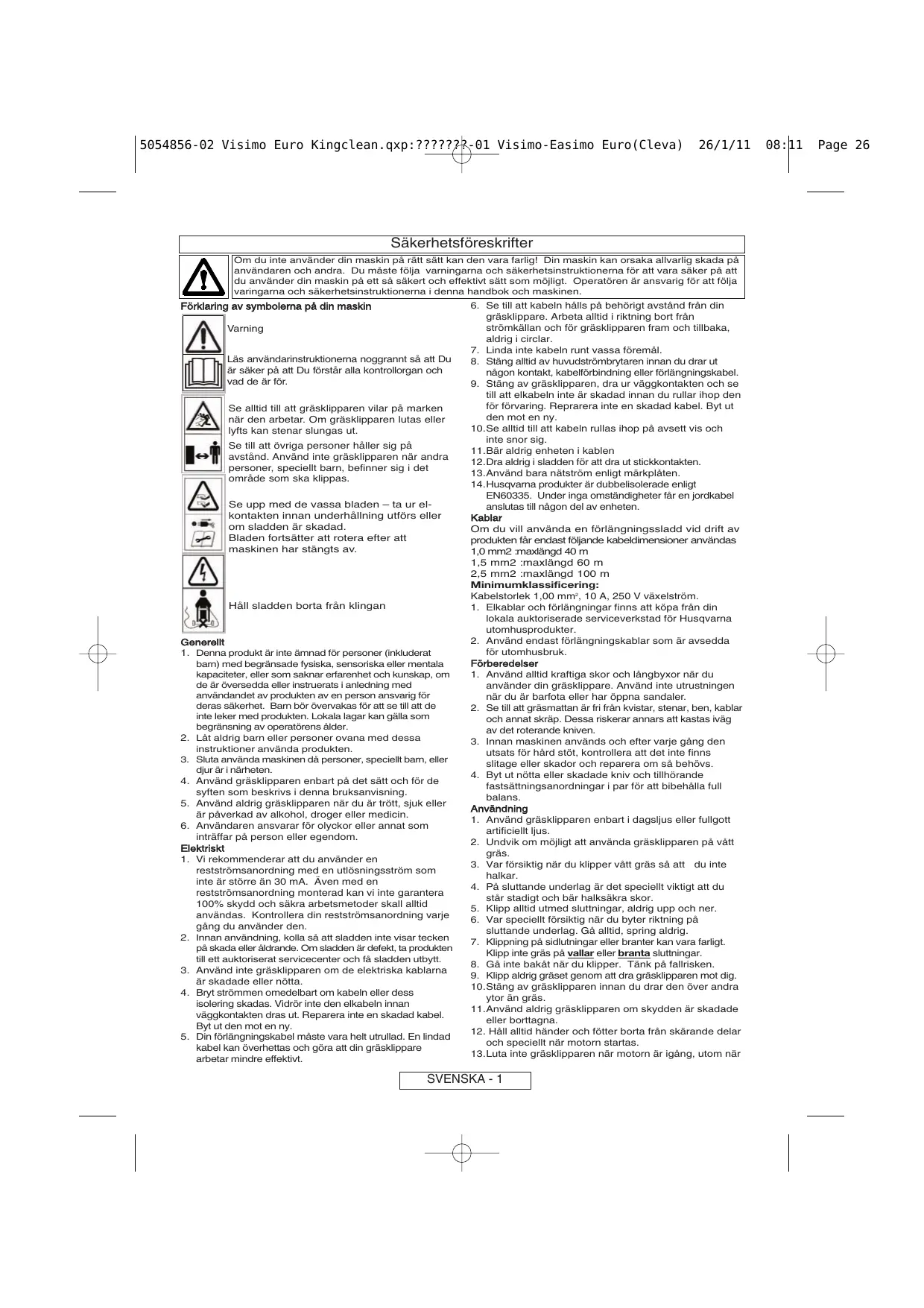 och speciellt när motorn startas. 13.Luta inte gräsklipparen när motorn är igång, utom när SVENSKA - 1 08:11 Page 26 5054856-02 Visimo Euro Kingclean.qxp:???????-01 Visimo-Easimo Euro(Cleva) 26/1/11 Säkerhetsföreskrifter du startar och stoppar den. I dessa fall ska du inte luta gräsklipparen mer än nödvändigt och enbart lyfta den del som pekar bort från användaren. Se alltid till att båda händerna befinner sig i arbetsläge innan du släpper ned gräsklipparen på marken igen. 14.Placera inte händerna nära gräsutskastet. 15.Plocka aldrig upp eller bär en gräsklippare när den arbetar eller fortfarande är kopplad till ett vägguttag. 16.Bryt strömmen: - innan du lämnar gräsklipparen utan tillsyn under en längre tid, - innan du rensar bort en tilltäppning, - innan du undersöker, rengör eller utför underhållsarbeten på gräsklipparen, - om du stöter mot ett objekt. Använd inte din gräsklippare tills du är säker på att gräsklipparen är säker att använda, - om gräsklipparen vibrerar på ett onormalt sätt. Undersök omedelbart. Stora vibrationer kan förorsaka skador. Underhåll och förvaring