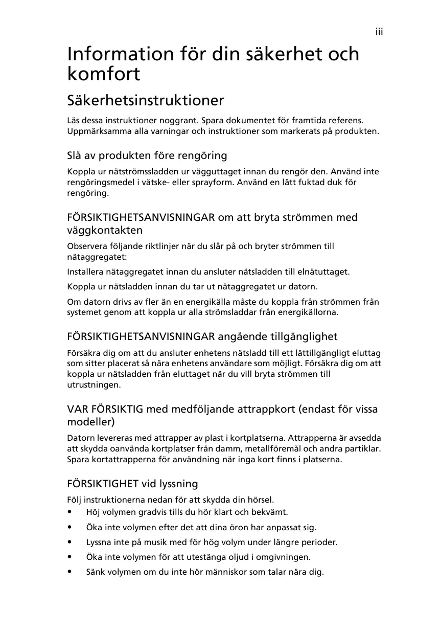 Aspire-serien Allmän användarguide © 2010 Med ensamrätt. Aspire-serien Allmän användarguide Ursprunglig utgåva: 07/2010 Aspire-serien - bärbar PC-dator Modellnummer: ___________________________________ Serienummer: _____________________________________ Inköpsdatum: _____________________________________ Inköpsställe: _______________________________________ iii Information för din säkerhet och komfort Säkerhetsinstruktioner Läs dessa instruktioner noggrant. Spara dokumentet för framtida referens. Uppmärksamma alla varningar och instruktioner som markerats på produkten. Slå av produkten före rengöring Koppla ur nätströmssladden ur vägguttaget innan du rengör den. Använd inte rengöringsmedel i vätske- eller sprayform. Använd en lätt fuktad duk för rengöring. FÖRSIKTIGHETSANVISNINGAR om att bryta strömmen med väggkontakten Observera följande riktlinjer när du slår på och bryter strömmen till nätaggregatet: Installera nätaggregatet innan du ansluter nätsladden till elnätuttaget. Koppla ur nätsladden innan du tar ut nätaggregatet ur datorn. Om datorn drivs av fler än en energikälla måste du koppla från strömmen från systemet genom att koppla ur alla strömsladdar från energikällorna. FÖRSIKTIGHETSANVISNINGAR angående tillgänglighet Försäkra dig om att du ansluter enhetens nätsladd till ett lättillgängligt eluttag som sitter placerat så nära enhetens användare som möjligt. Försäkra dig om att koppla ur nätsladden från eluttaget när du vill bryta strömmen till utrustningen. VAR FÖRSIKTIG med medföljande attrappkort (endast för vissa modeller) Datorn levereras med attrapper av plast i kortplatserna. Attrapperna är avsedda att skydda oanvända kortplatser från damm, metallföremål och andra partiklar. Spara kortattrapperna för användning när inga kort finns i platserna. FÖRSIKTIGHET vid lyssning Följ instruktionerna nedan för att skydda din hörsel. Höj volymen gradvis tills du hör klart och bekvämt.