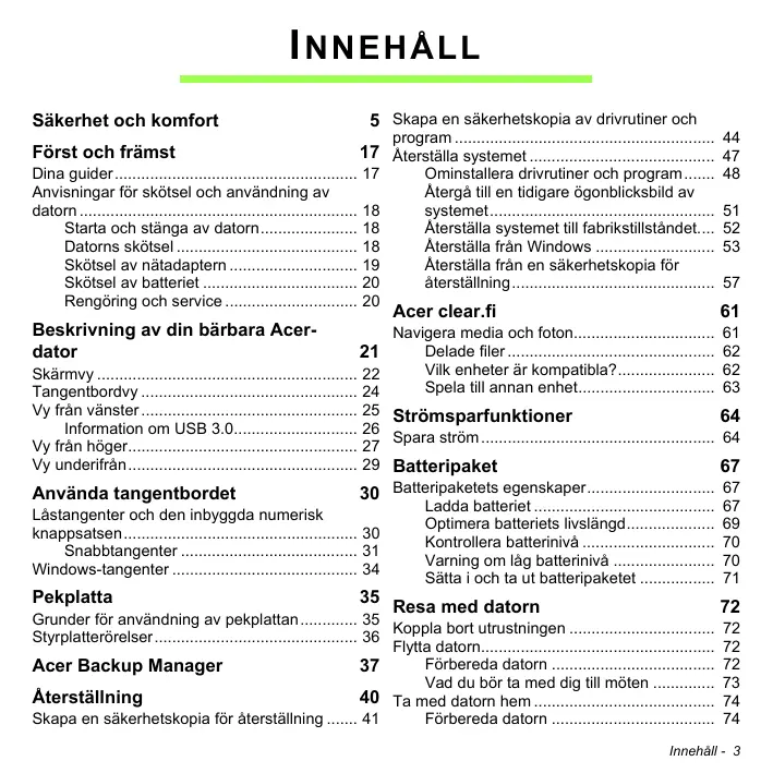 Grunder för användning av pekplattan 35 Koppla bort utrustningen Styrplatterörelser 36 Flytta datorn Förbereda datorn Acer Backup Manager 37 Vad du bör ta med dig till möten Återställning 40 Ta med datorn hem Skapa en säkerhetskopia för återställning 41 Förbereda datorn