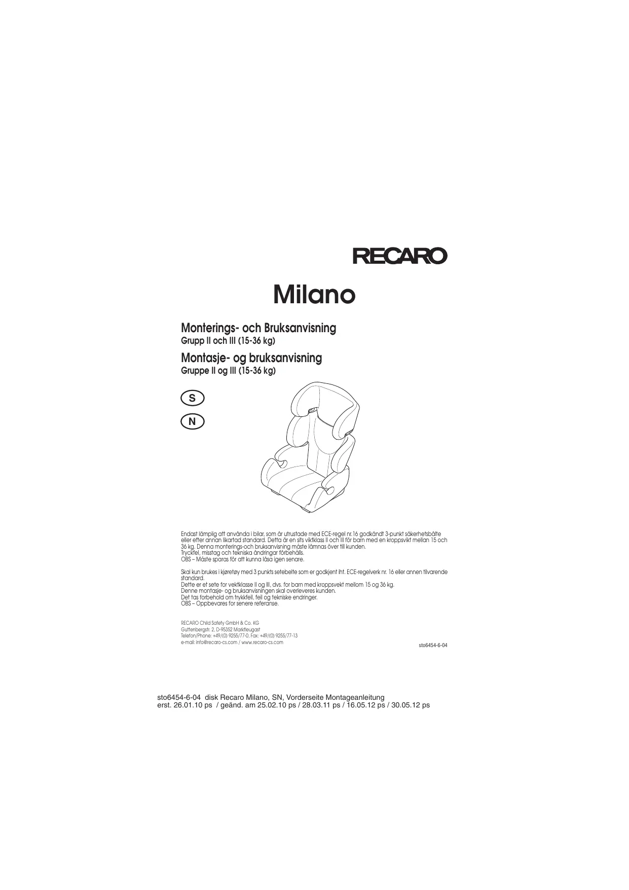 S N Endast lämplig att använda i bilar, som är utrustade med ECE-regel nr.16 godkändt 3-punkt säkerhetsbälte eller efter annan likartad standard. Detta är en sits viktklass II och III för barn med en kroppsvikt mellan 15 och 36 kg. Denna monterings-och bruksanvisning måste lämnas över till kunden. Tryckfel, misstag och tekniska ändringar förbehålls. OBS – Måste sparas för att kunna läsa igen senare. Skal kun brukes i kjøretøy med 3 punkts setebelte som er godkjent iht. ECE-regelverk nr. 16 eller annen tilvarende standard. Dette er et sete for vektklasse II og III, dvs. for barn med kroppsvekt mellom 15 og 36 kg. Denne montasje- og bruksanvisningen skal overleveres kunden. Det tas forbehold om trykkfeil, feil og tekniske endringer. OBS – Oppbevares for senere referanse. RECARO Child Safety GmbH & Co. KG Guttenbergstr. 2, D-95352 Marktleugast Telefon/Phone: +49/(0) 9255/77-0, Fax: +49/(0) 9255/77-13 e-mail: info@recaro-cs.com / www.recaro-cs.com